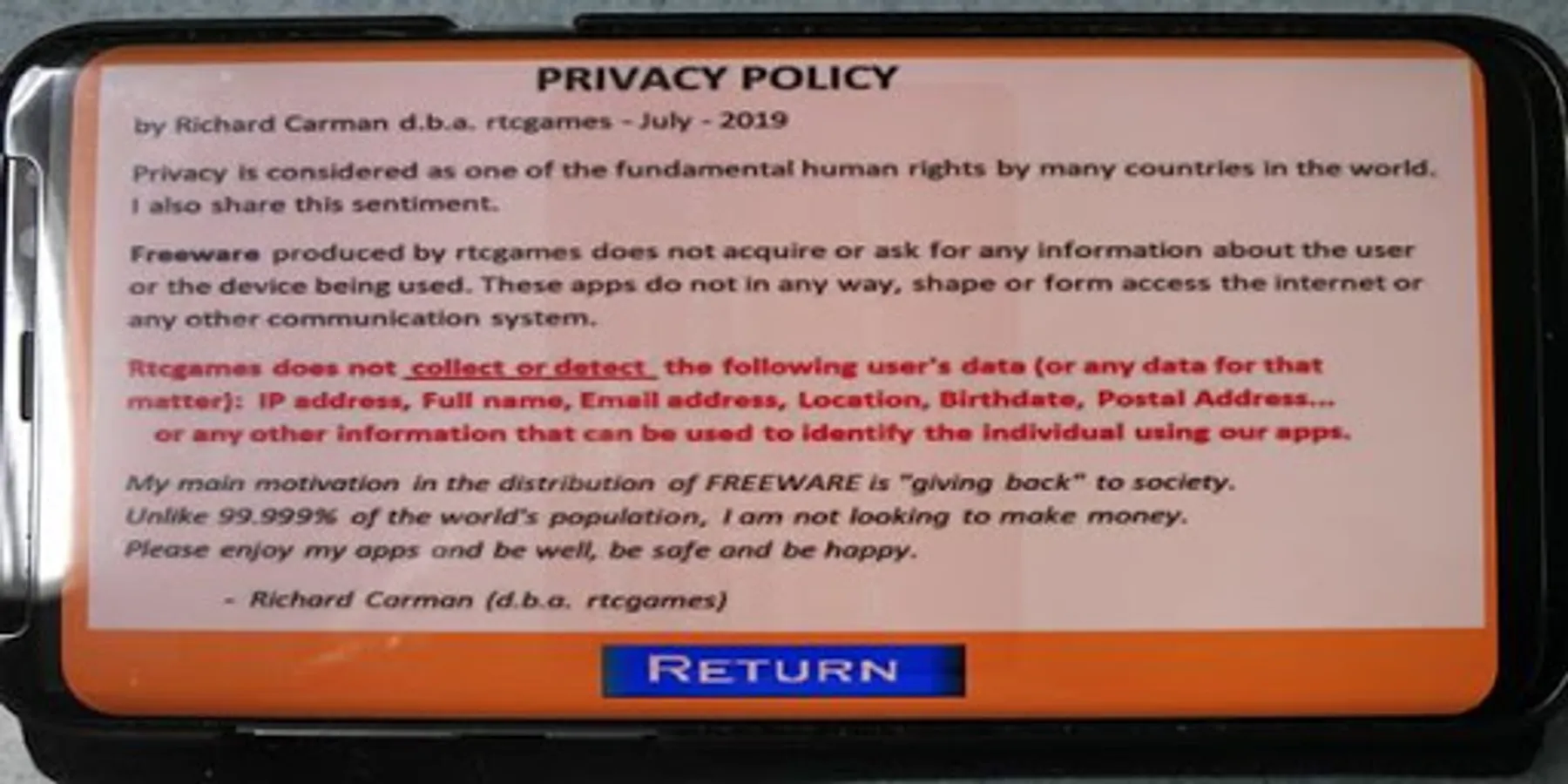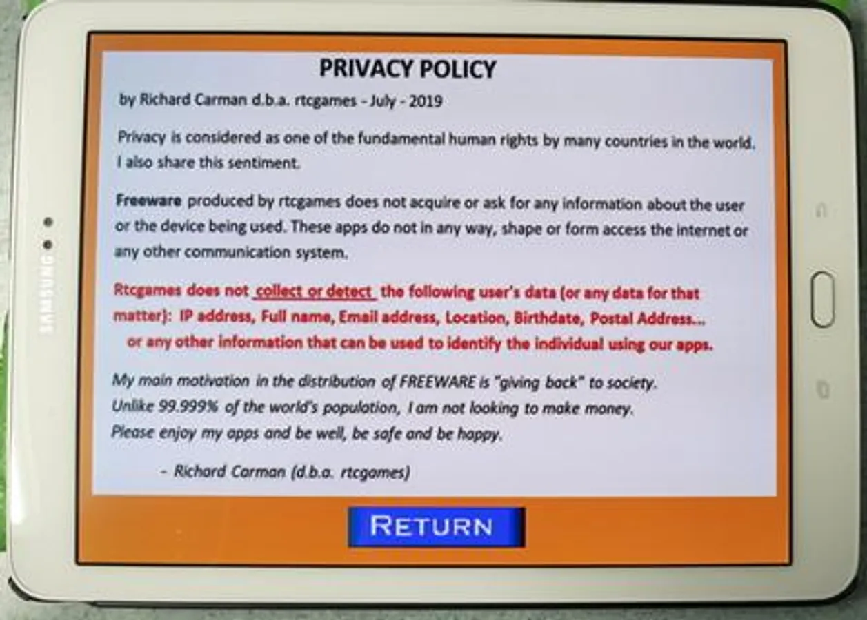 Freeware produced by rtcgames does not acquire or ask for any information about the user or the device being used. These apps do not in any way, shape or form access the internet or any other communication system.