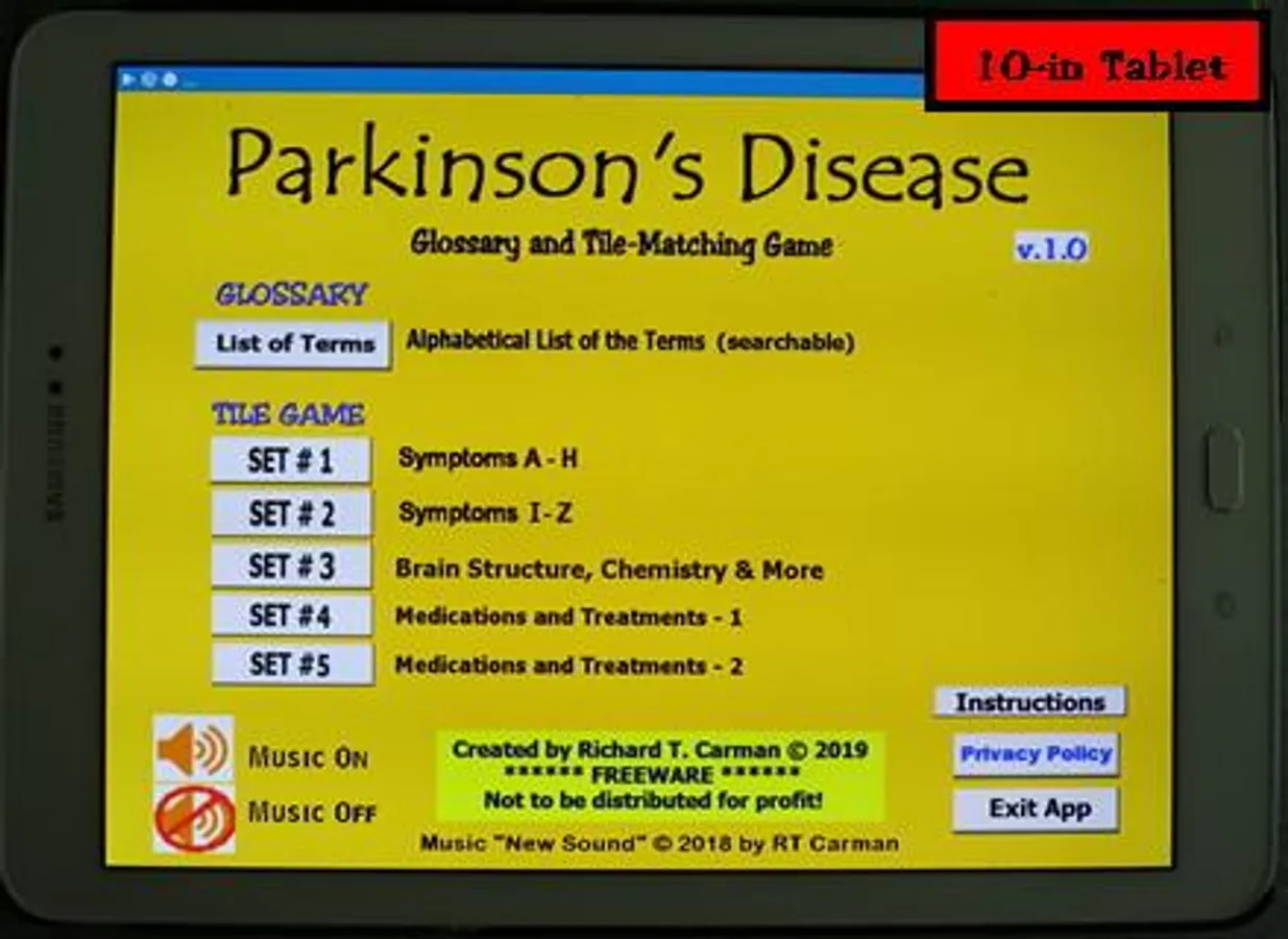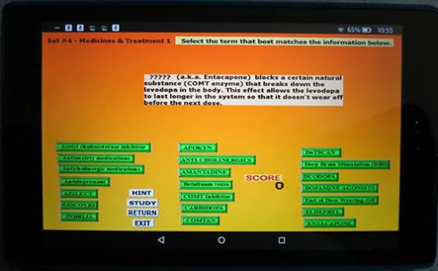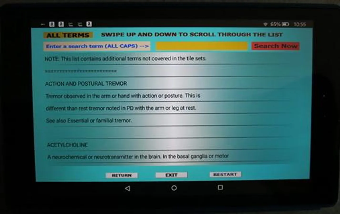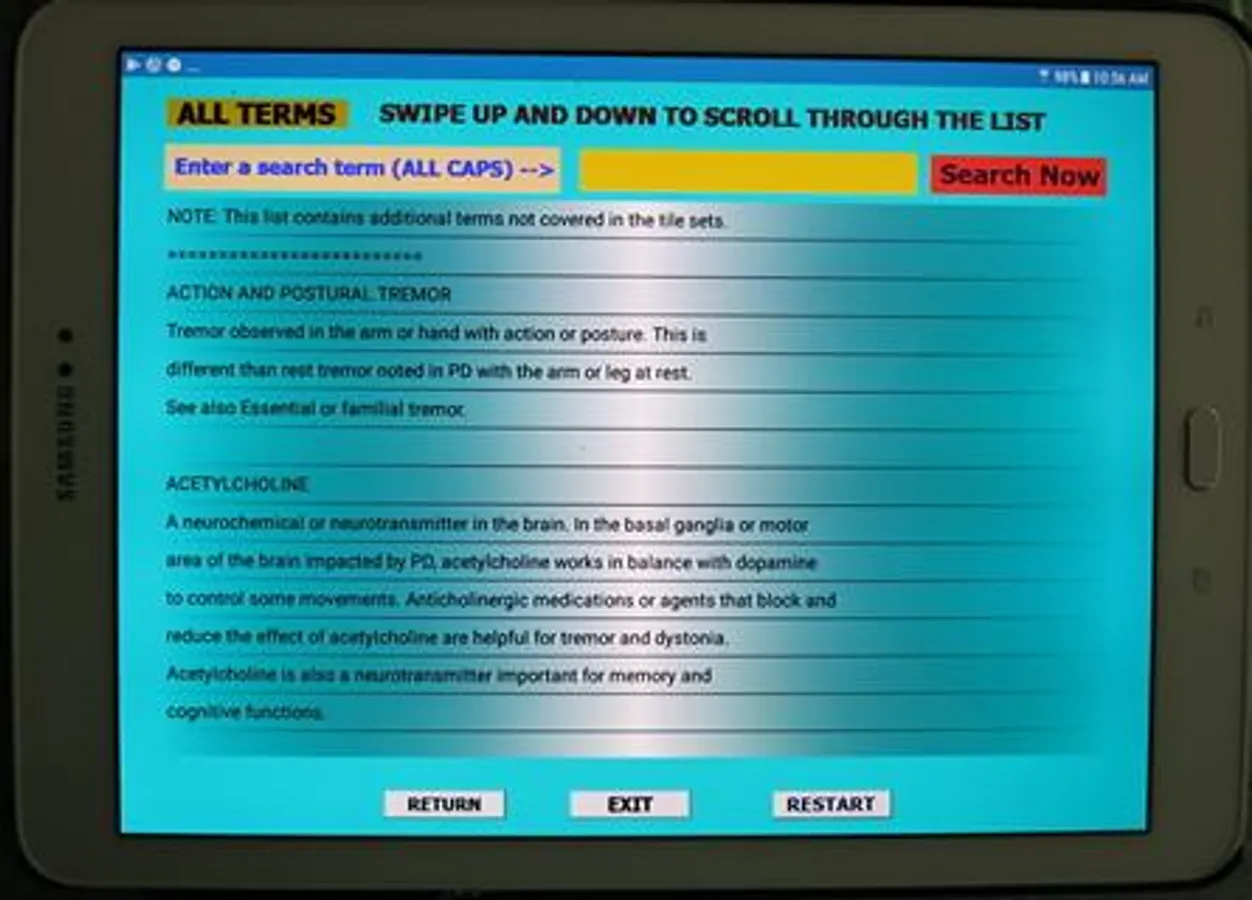 This is a FREE Android app which covers over 90 terms associated with Parkinson's Disease. Covers terms related to symptoms, treatments, medicines, and brain structure and function. The app contains a searchable glossary which includes the terms and their definitions. There is a tile game divided up into five screen which let's you practice recalling the information.