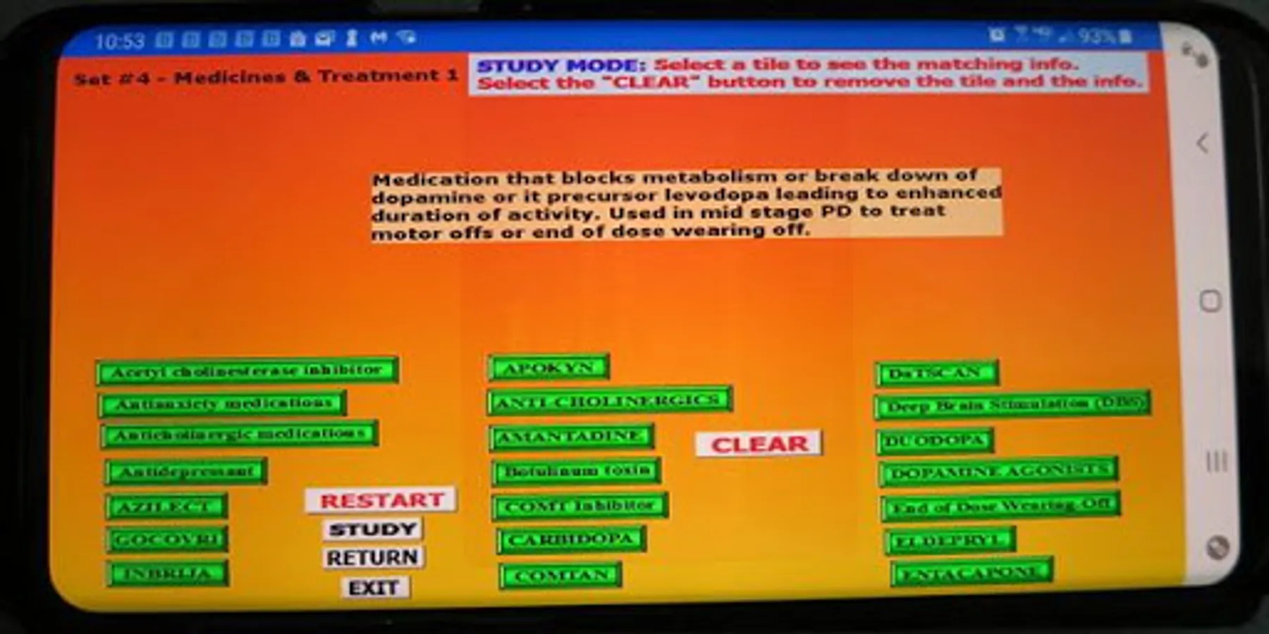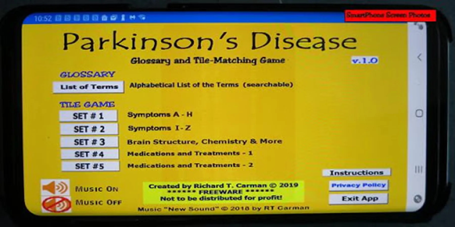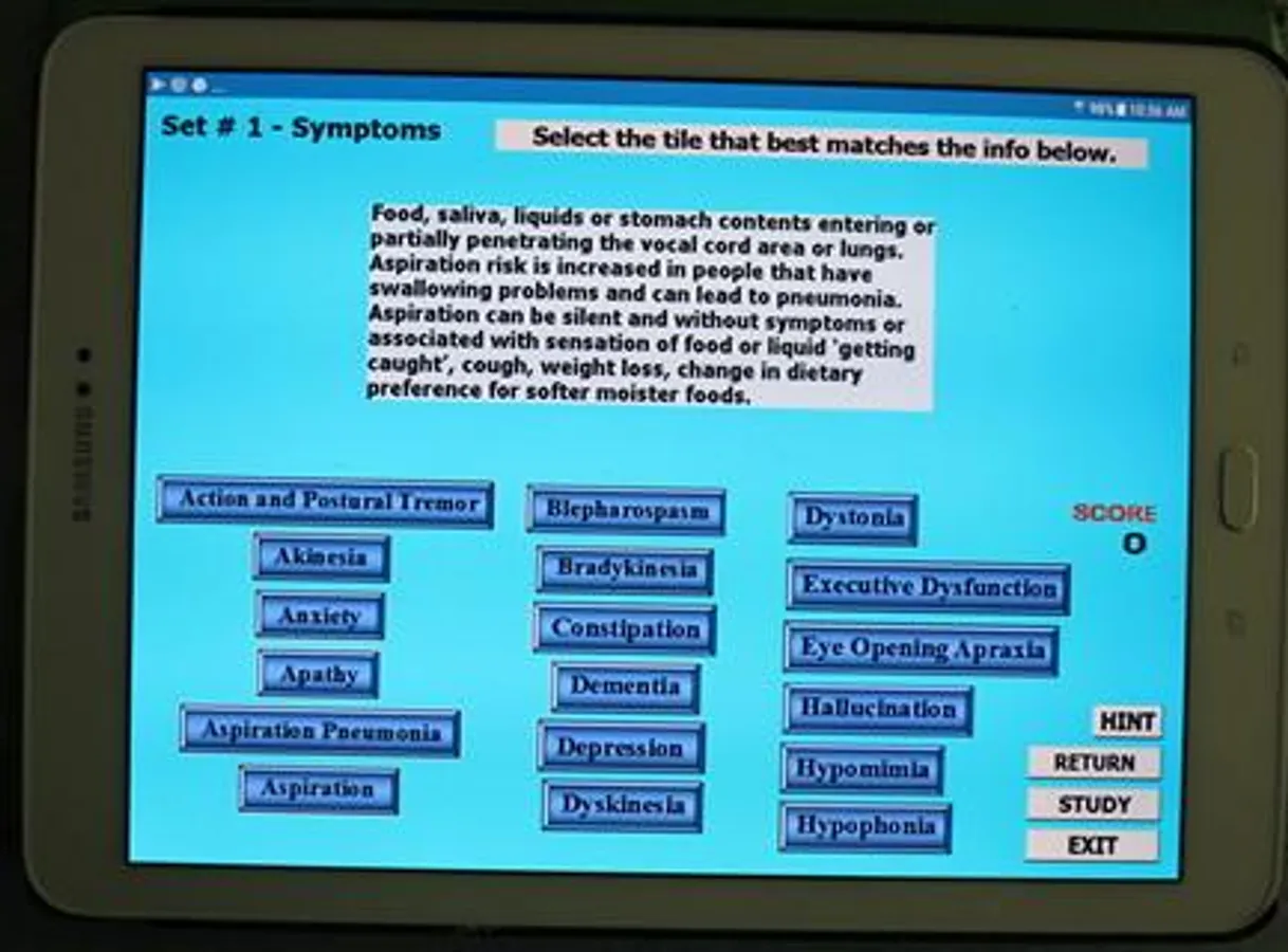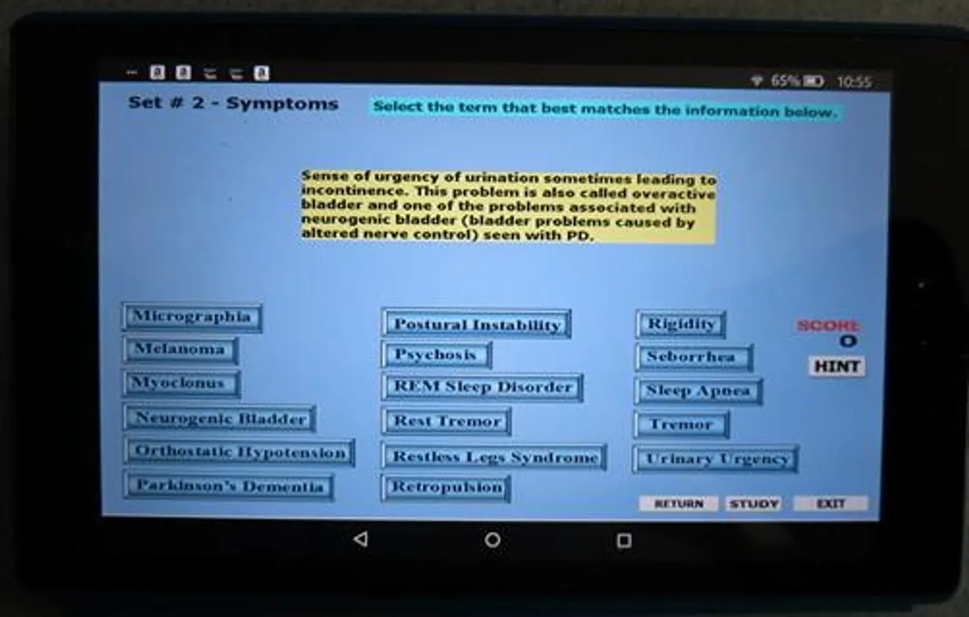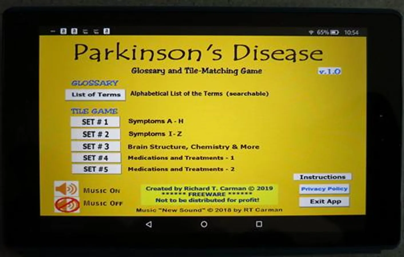 This is a FREE Android app which covers over 90 terms associated with Parkinson's Disease. Covers terms related to symptoms, treatments, medicines, and brain structure and function. The app contains a searchable glossary which includes the terms and their definitions. There is a tile game divided up into five screen which let's you practice recalling the information.
