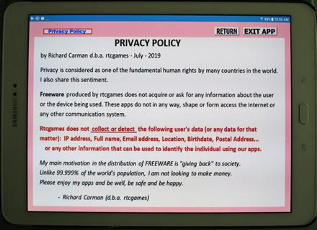This app does not require any permissions upon installation and does not collect any personal information at all. There is no access to the internet, no registration, and no advertising. It can be used without wifi when you are at a medical facility or in an isolated area. Great way to learn more about Parkinson's Disease. It will work on Android versions 5.0 and higher. Visit https://sites.google.com/view/rtcgames/home for download options.