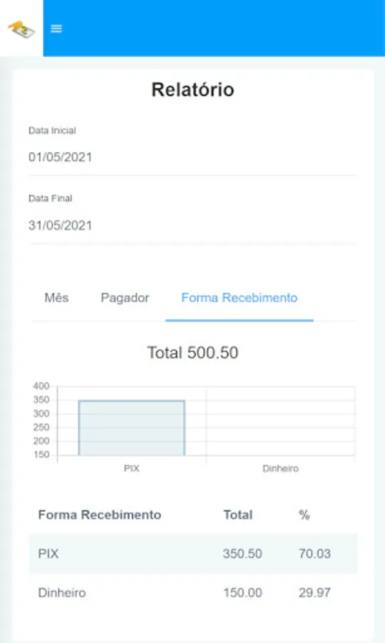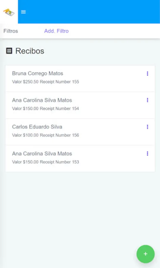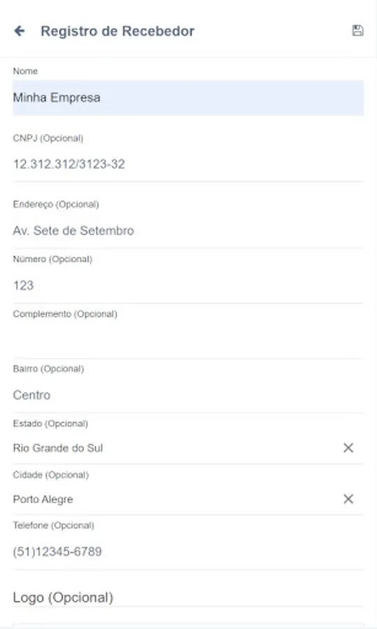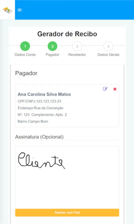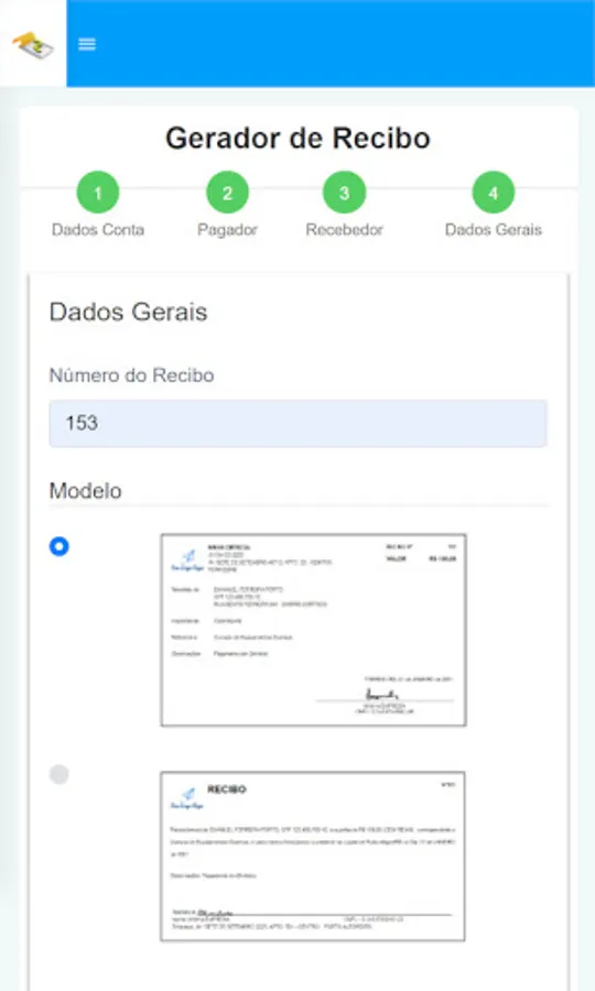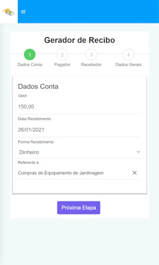 In four easy and quick steps to create, add your company data (Name, CNPJ/CPF, address, logo...) the payer data (Name, CNPJ/CPF...), enter the value and referent. And generate the receipt.