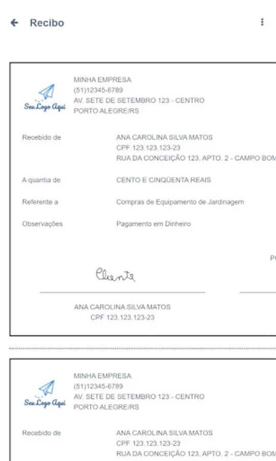Simple receipt generator for customers with logo and signature, available with two printable templates. Functions to save in PDF and share by email and WhatsApp.