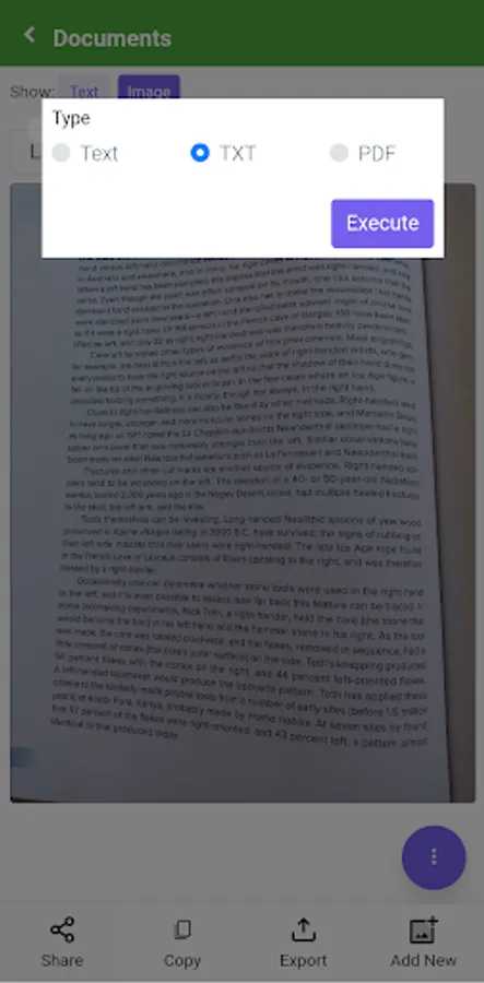Image scanner app for text conversion. Take a photo of the document, choose from your image gallery or PDF for the app to scan the document, identify the text, and allow you to save it in .txt or PDF format.