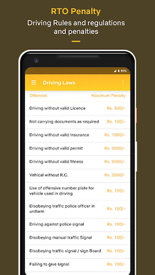➠ In this section, you can access the complete list of various driving laws and their penalties charged by Regional Transport Office department.