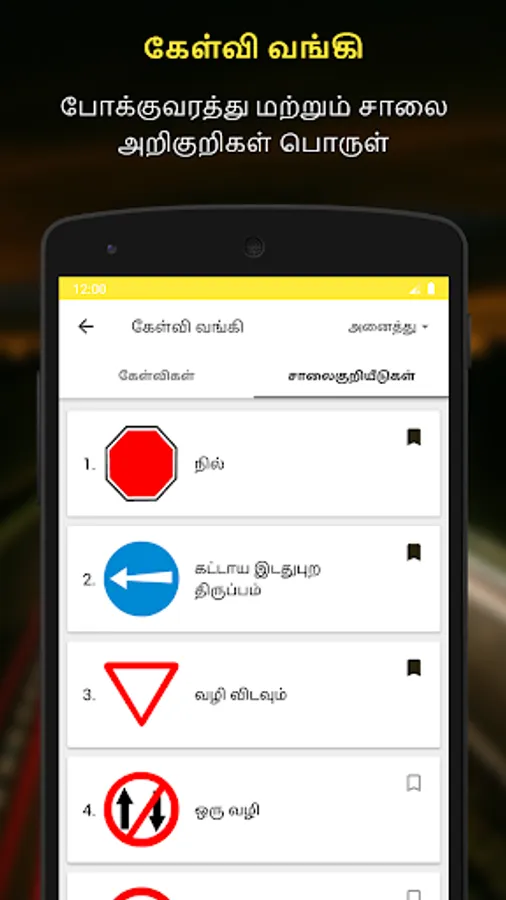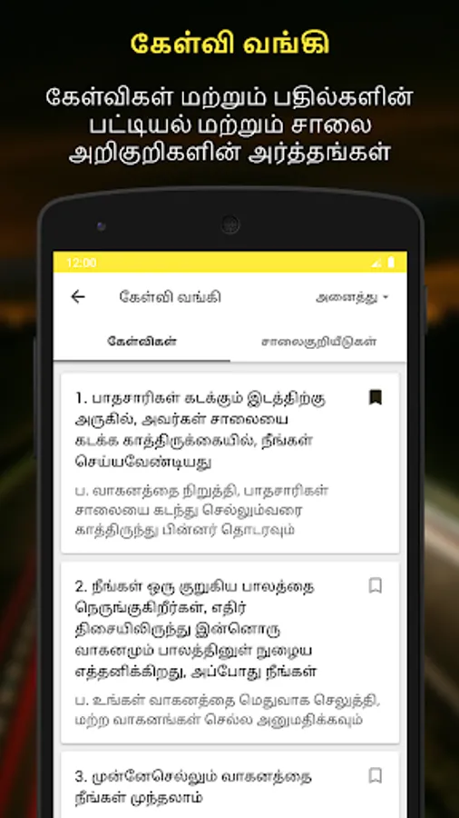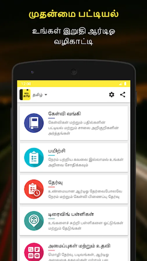 RTO Exam Tamil is a Driving Licence Test app available in Tamil (தமிழ்) and English. Are you appearing for Learning Licence Test in RTO Tamil Nadu and willing to practice before actual RTO test? Look no further than RTO Exam Tamil. This app has been especially created for RTO Tamil Nadu and it offers largest collection of learning licence test questions and answers, road signs and their meaning and other useful information in Tamil (தமிழ்) and English.