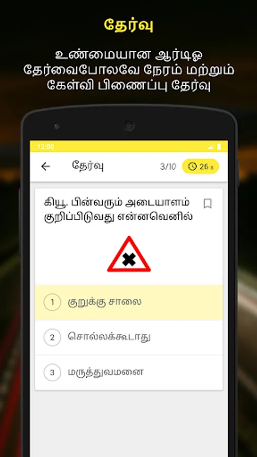 Time Bound Test: Exactly same as Tamil Nadu RTO test, random questions and road signs related questions will be asked in this exam. Time limit for each question is exactly same as approved by state RTO Tamil Nadu.