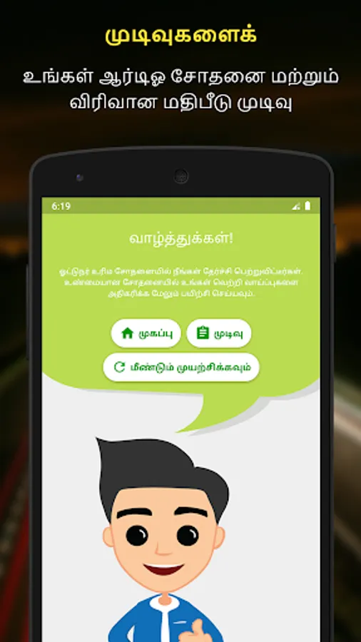 RTO Exam Tamil app is only for public awareness and do not have any association with any state RTO. Though all efforts have been made to ensure the accuracy of the content, the same should not be construed as a statement of law or used for any legal purposes. This application accepts no responsibility in relation to the accuracy, completeness, usefulness or otherwise, of the contents. Users are advised to verify/check any information with the Regional Transport Department at https://parivahan.gov.in/parivahan