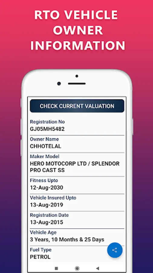 You can also Track Vehicle Current valuation, Owner name ,Registration Name and other Useful Details like city, state, model, type.