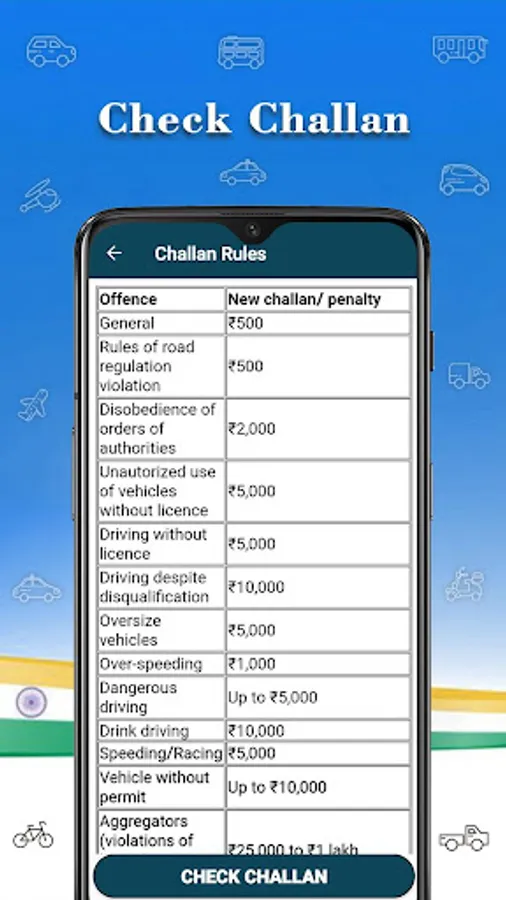 Get details of challans issued to any vehicle or driver just by using a vehicle (RC) or license number. Details include challan number, date of issue , challan rules and payment status.