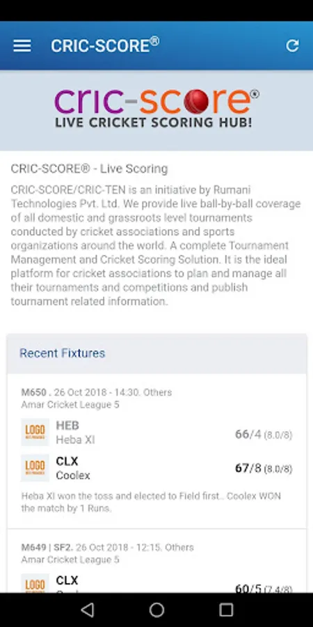 CRIC-SCORE/CRIC-TEN is an initiative by Rumani Technologies Pvt. Ltd. We provide live ball-by-ball coverage of all domestic and grassroots level tournaments conducted by cricket associations and sports organizations around the world. A complete Tournament Management and Cricket Scoring Solution. It is the ideal platform for cricket associations to plan and manage all their tournaments and competitions and publish tournament related information.