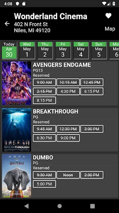 The app provides instant access to available showtimes, seats, pricing, and theatre information.