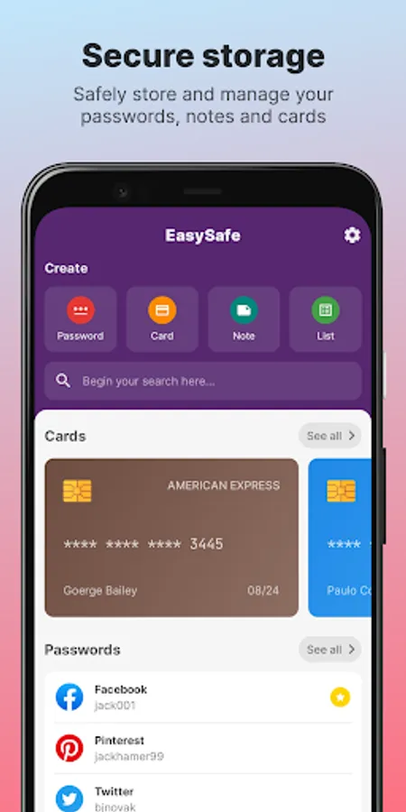 EasySafe is a secure password manager app which lets you store your passwords, cards and notes with personalization and security ensuring peace of mind and convenience.