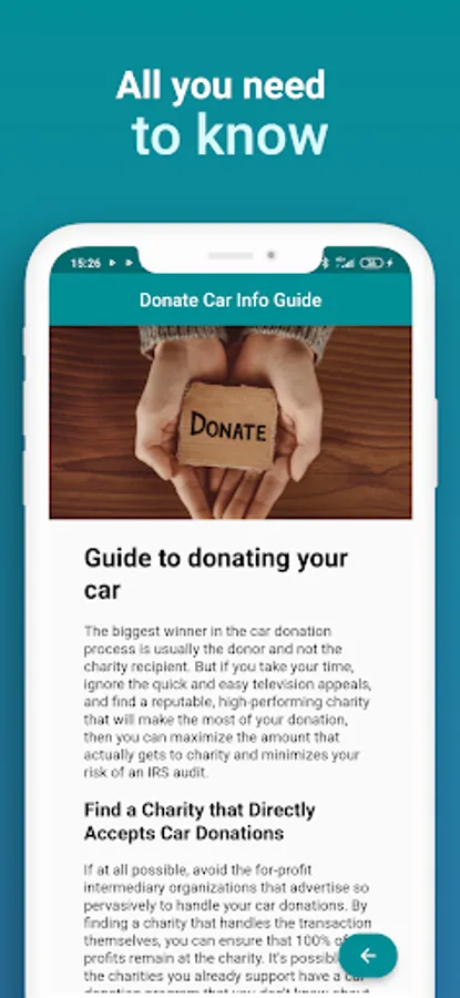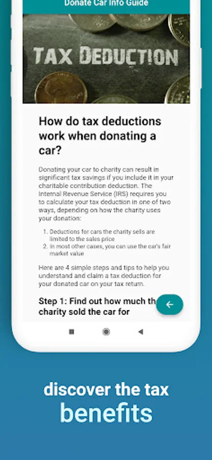 The "Donate Car: Info Guide" app is a great way to learn about the process of donating a car in the US. You'll find detailed information about how to donate a car, the potential benefits of doing so, and local charities that accept car donations. With this app, you'll have all the information you need to make your donation as easy and rewarding as possible.