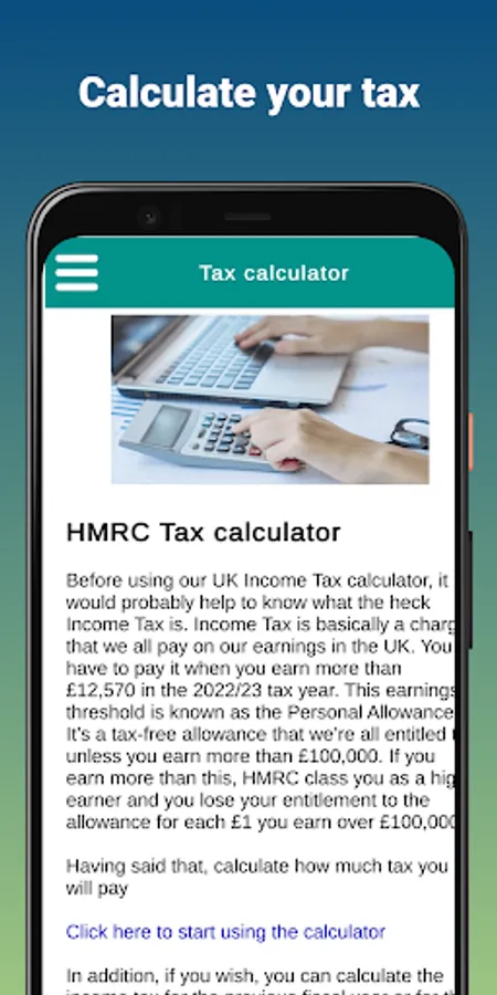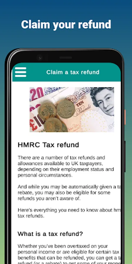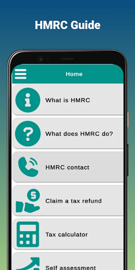 HMRC also administers various benefits such as child benefit, working tax credit and universal credit. In our "HMRC Info Guide" app we aim to provide all the information you need about the UK tax authority. So within the app you will be able to find information on: HMRC - Tax refund and tax calculator.