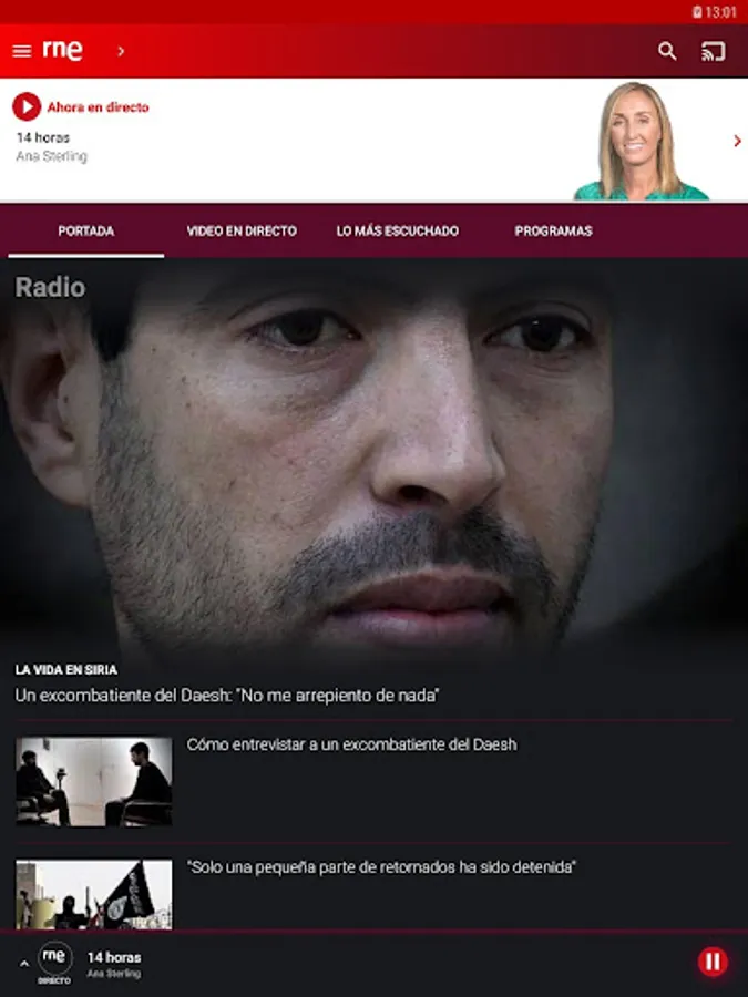 Radio 5: Newsletters every fifteen minutes. Time, traffic, art, society, science, technology, etc. All outreach news is given live on RNE.