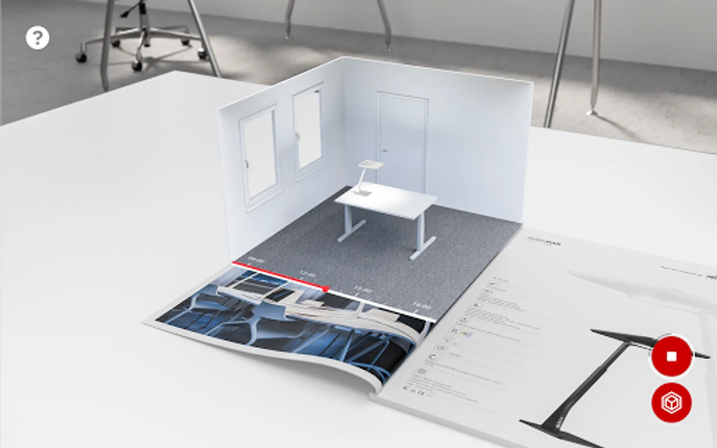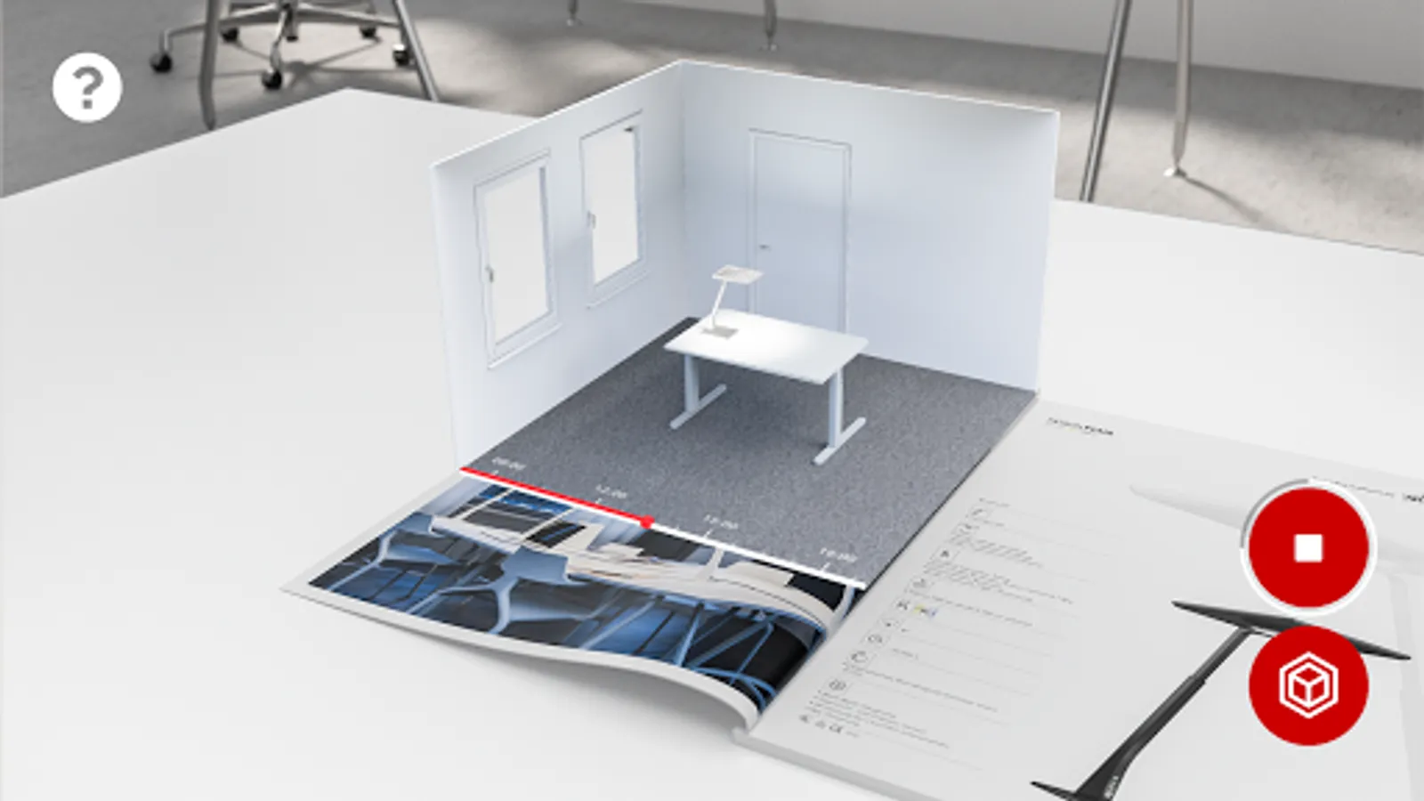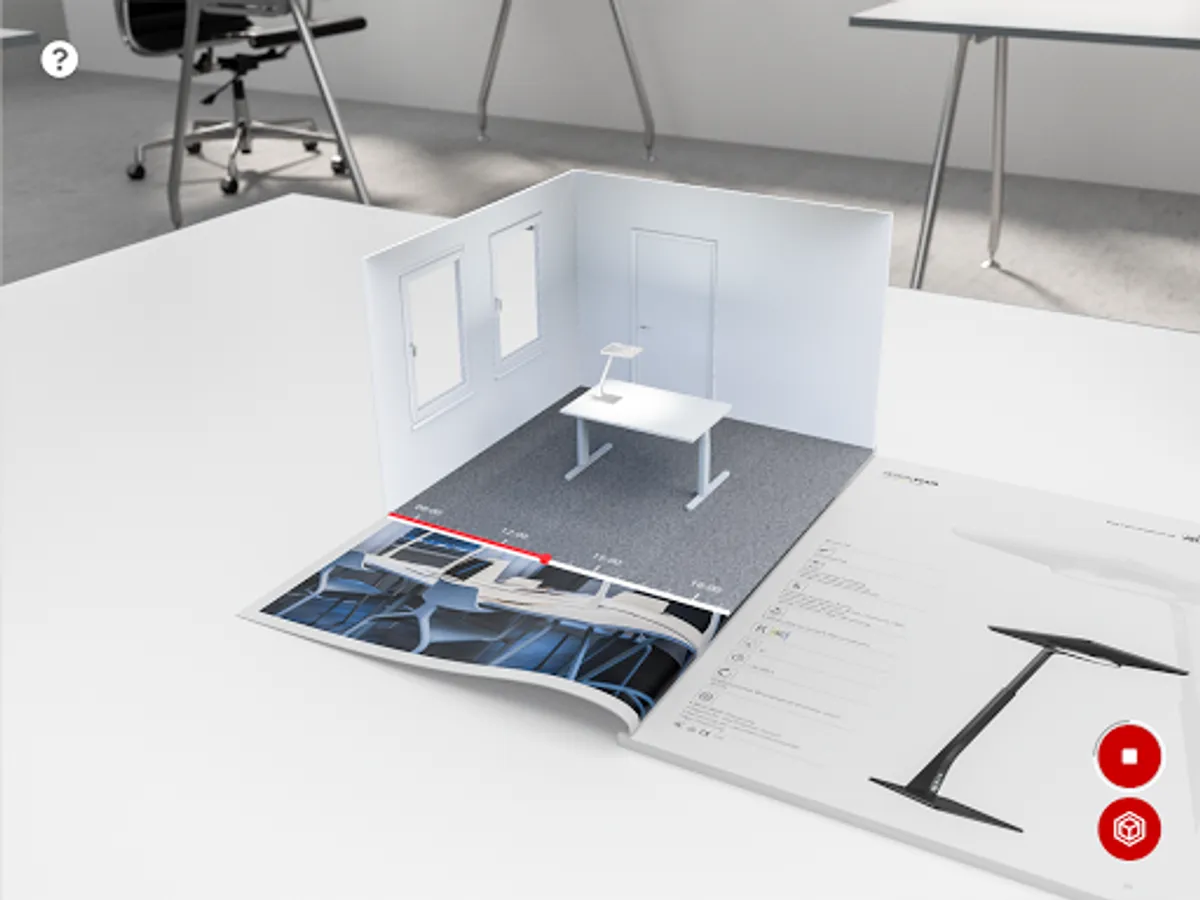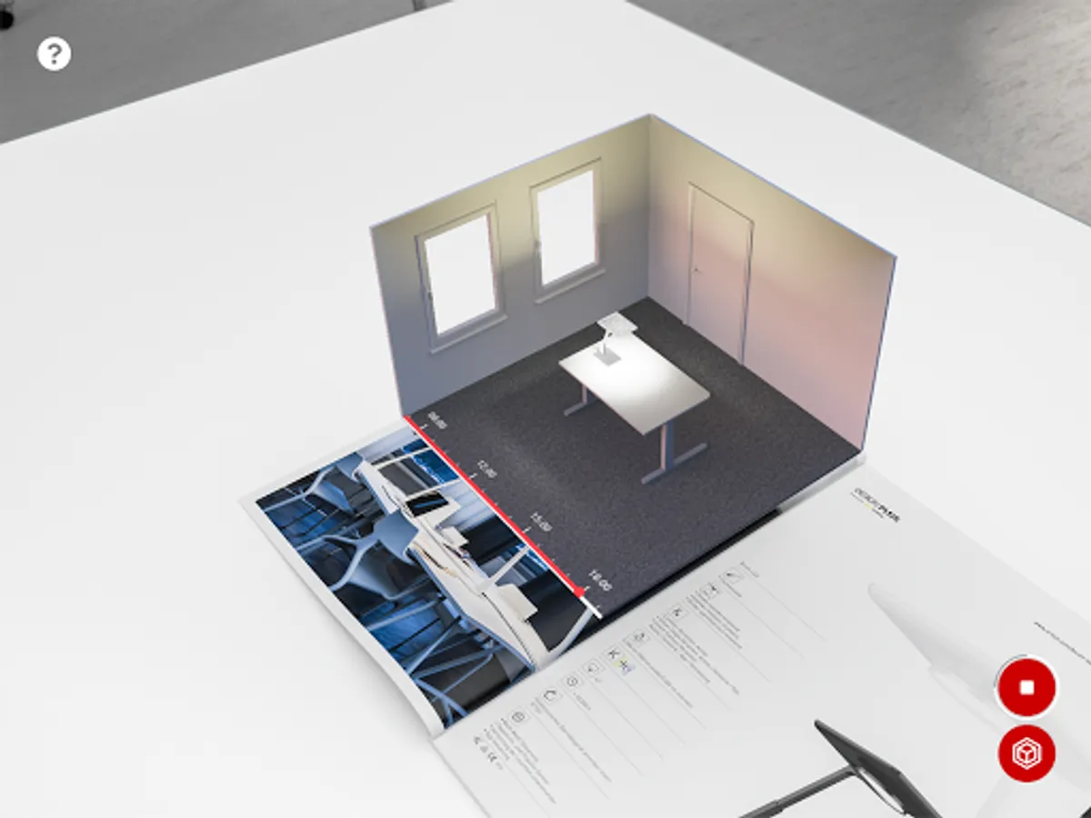 If you are interested in experiencing the augmented reality function please visit our website and order or download and print our AR-capable brochures and catalogues at www.trilux.com/catalogues. Start the AR app, and scan the application and/or product pages of the products marked with the AR symbol in the brochure/catalogue with the camera. The 3D model is displayed as soon as both angle and distance are correct. Click on the symbols and let the TRILUX world surprise you!
