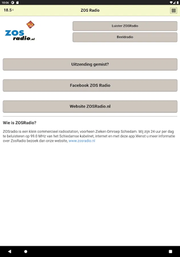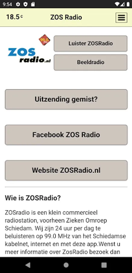 ZosRadio is a small commercial radio station, formerly Sick Broadcasting Schiedam. We listen to 24 hours a day on 99.0 MHz of Schiedam cable network, internet and with this app. For more information about ZosRadio visit our website www.zosradio.nl