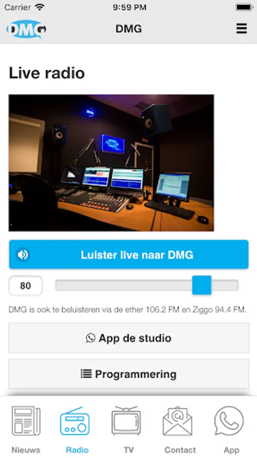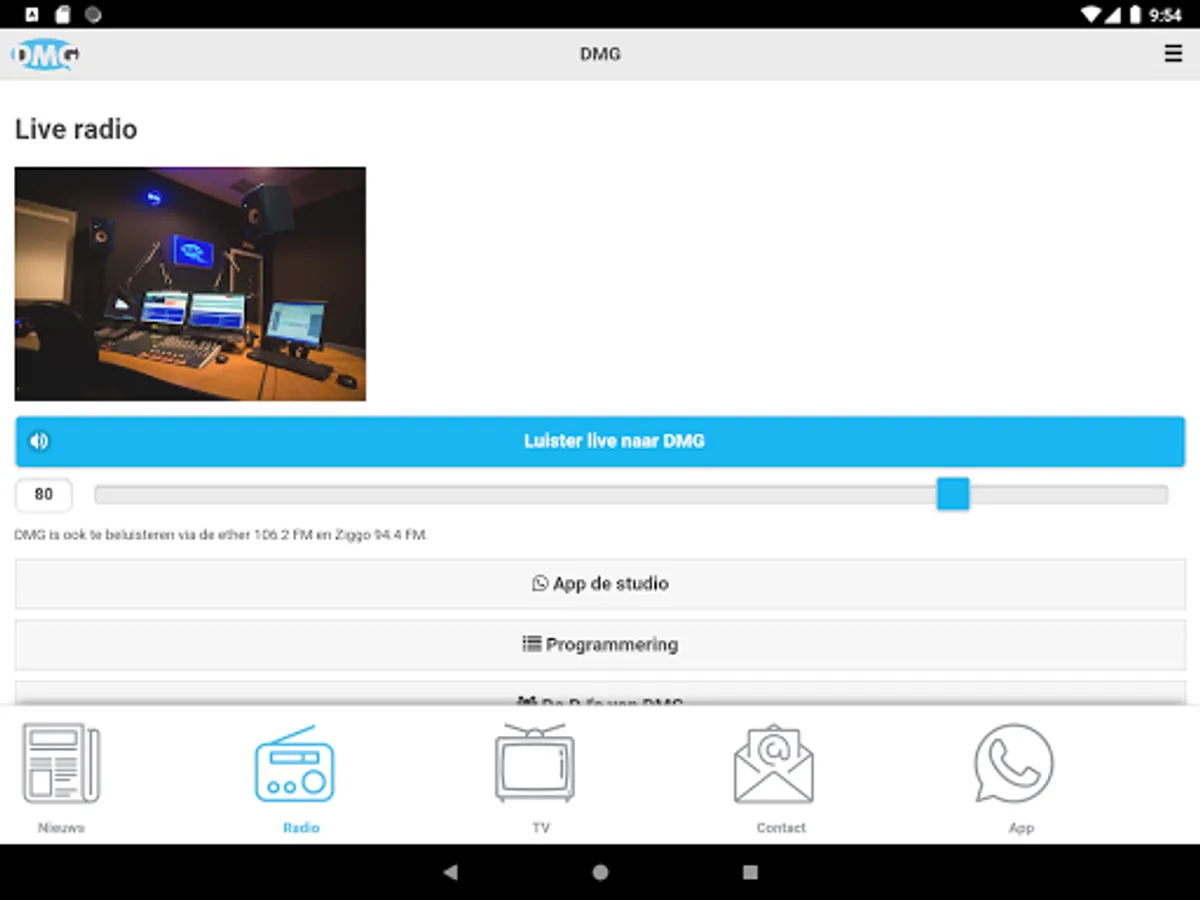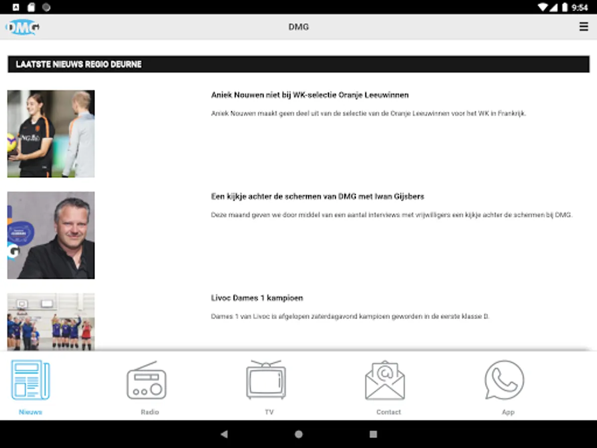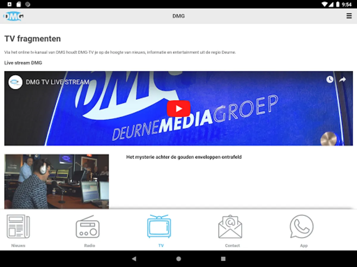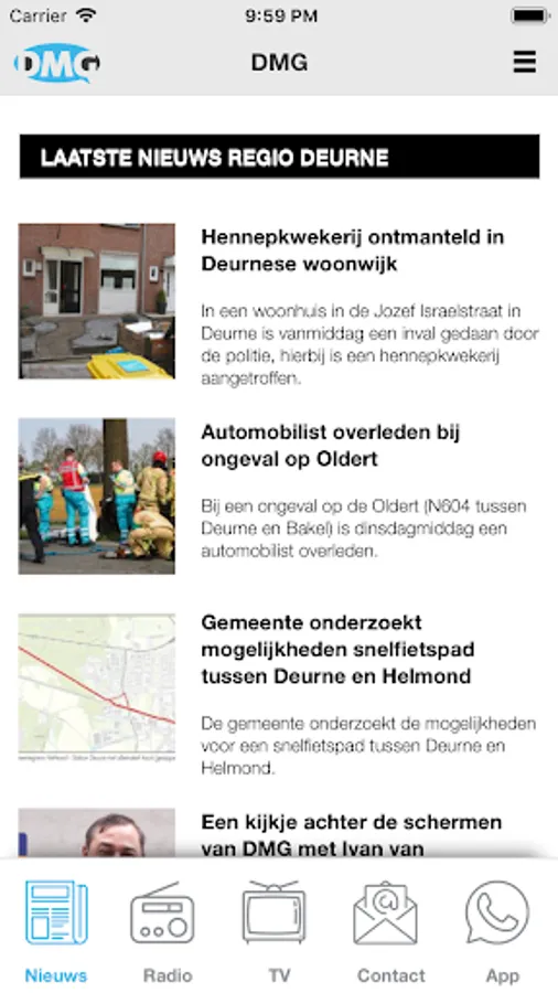 This is the app from DMG, the Deurne Media Group. Here you can view the news from Deurne and surroundings. And listen to the DMG broadcasts live and you can listen to them again.