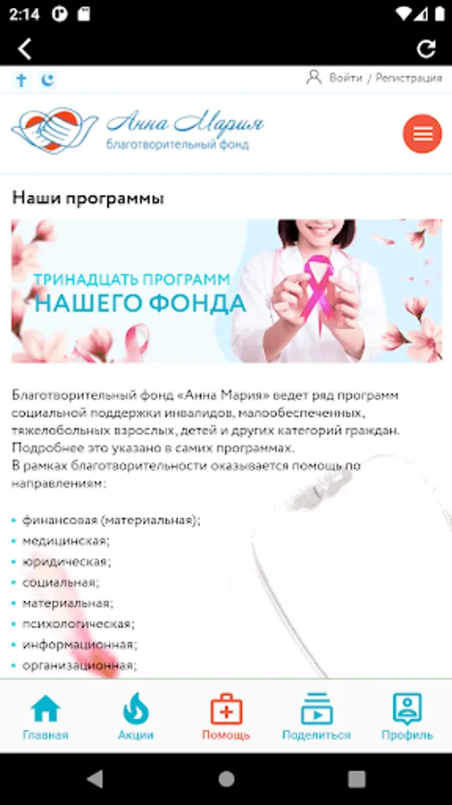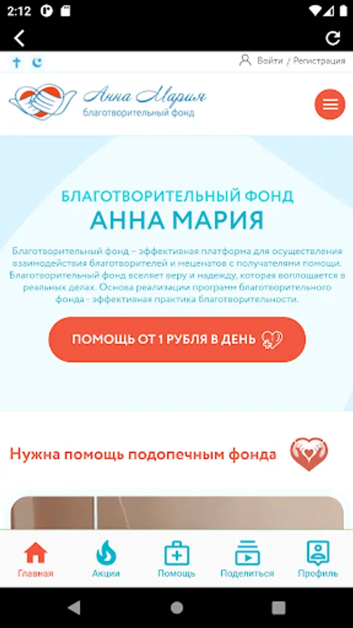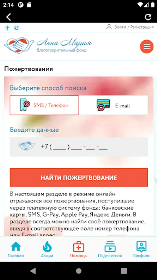 We are engaged in informing the society, volunteering, cooperating with treatment and rehabilitation centers. Just like on the website, there are different payment methods available in the app. You can also make a regular payment. All activity reports are regularly published on the Foundation's official website. We guarantee absolute security of transfers. No one sees the payer's personal data. The mobile application runs on Android and Apple iOS. Available in all regions of Russia, as well as CIS countries. The process of helping those in need has become even easier and more accessible. We invite you to join the project and become a big friendly team in a good cause!