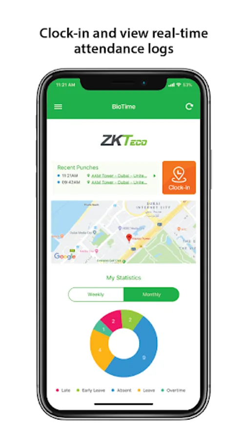 ZKBioTime is a mobile application which is connected in real time to the web-based time attendance software BioTime. The features included are clock-in with location details, raising and approval of requests by employees, announcements , reports and online notifications. Administrator and employee levels can be configured from the web server and the app is available in English/Arabic/Thai/Russian languages.
