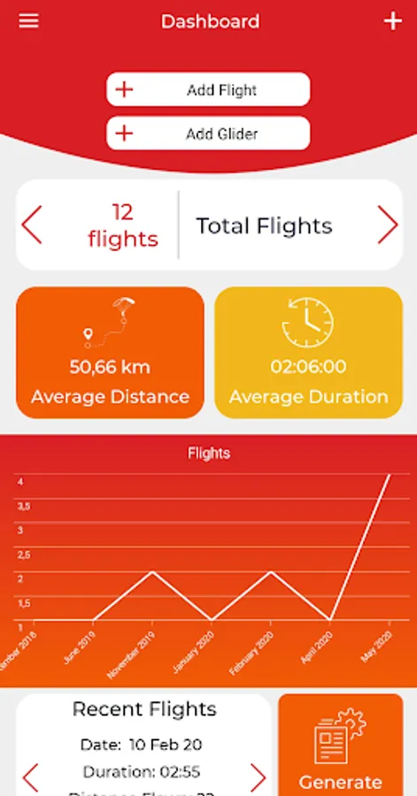 Quickly access Recent Information from your Dashboard by browsing Recent Flights, Lifetime Statistics and Monthly Statistics. Browse your track logs (.igc), view your flight route and elevation graphs, etc.
