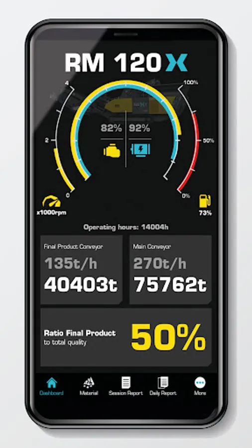 As a 24/7 digital assistant for mobile crushing and screening plants, RM XSMART can be called up anytime and anywhere using a smartphone. The data is available in real time and the various states of the machine, from fuel level to engine speed and optionally throughput, are displayed.