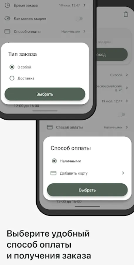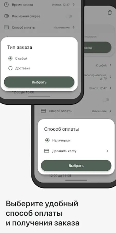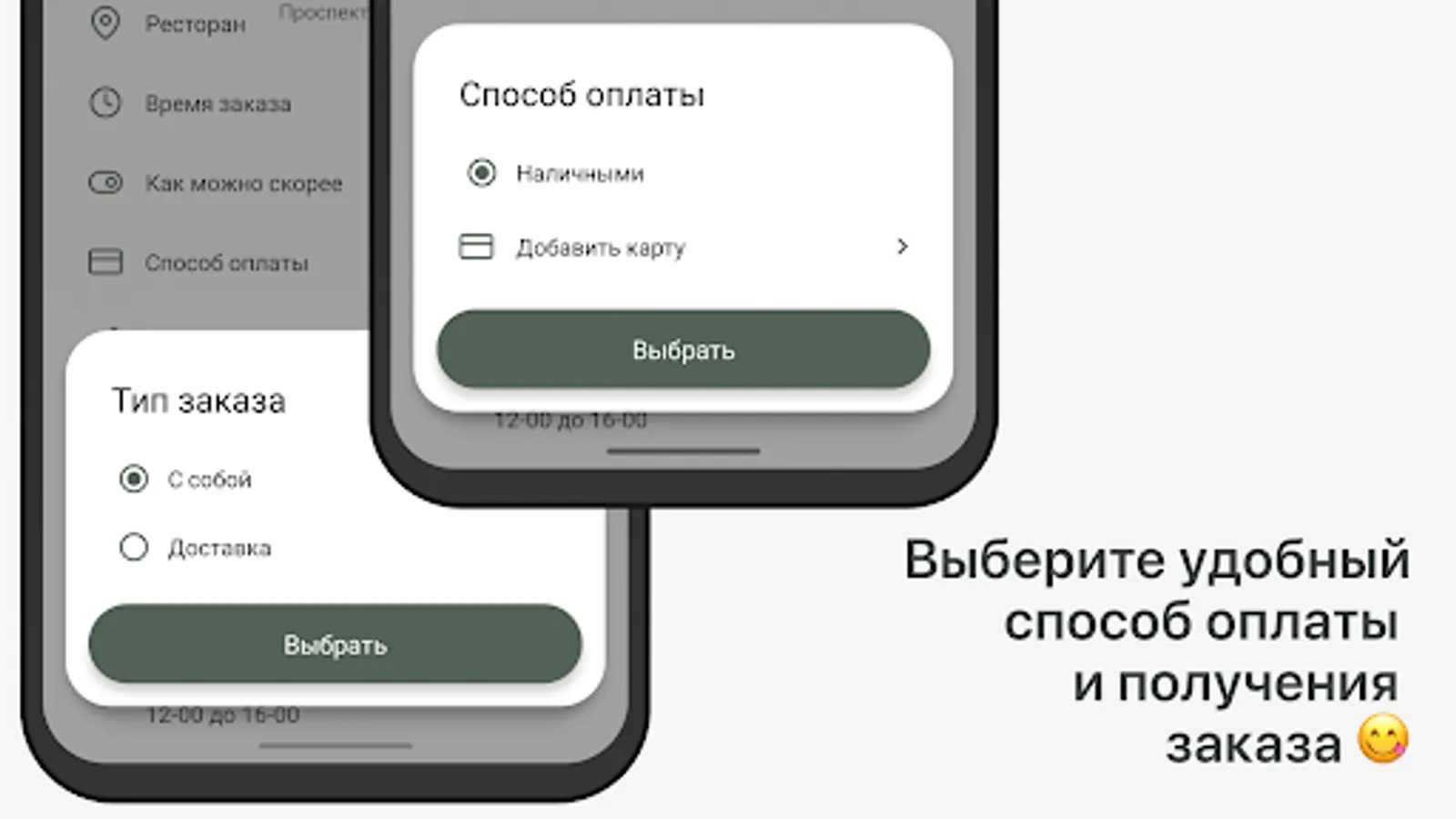 Specify the time when you want to pick up your order or select delivery with the time and address of delivery.