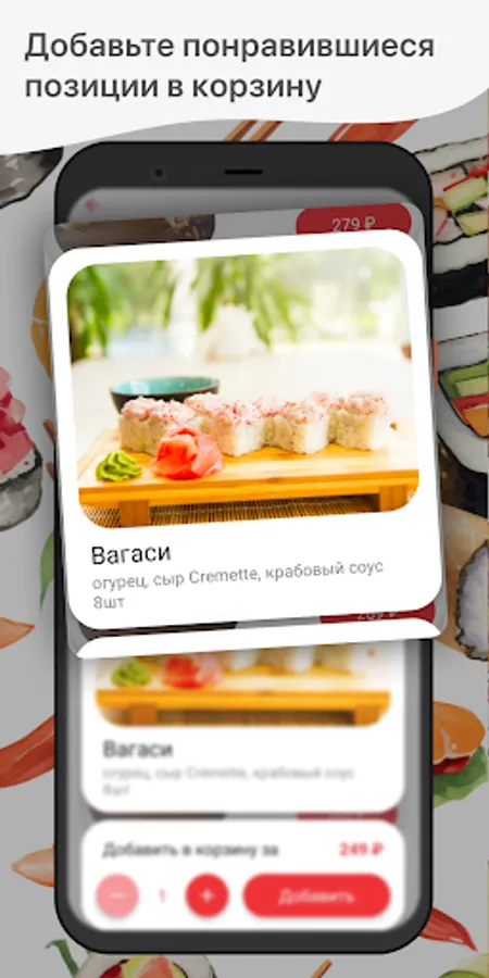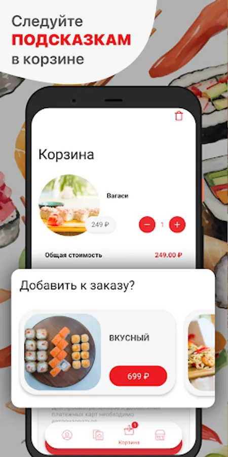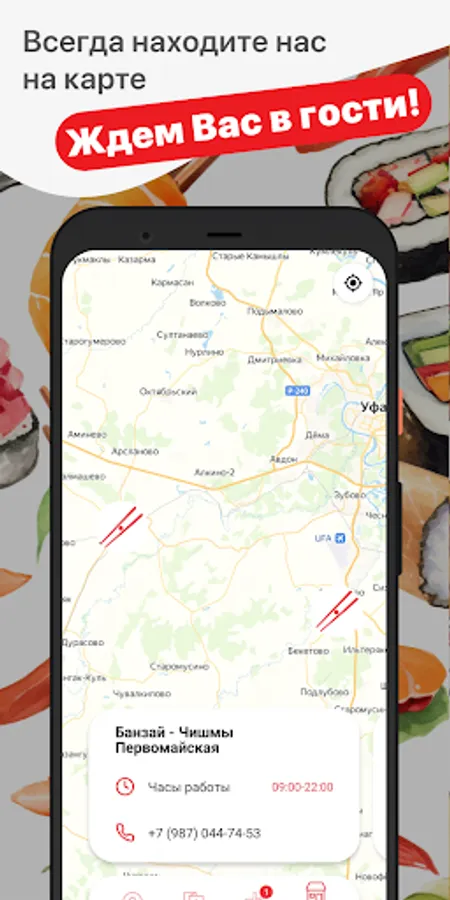 How to place an order in the Banzai application: select the items you like from the menu, add them to the basket and proceed to the checkout screen (by clicking on the basket icon).