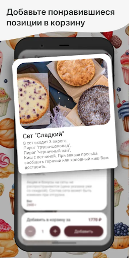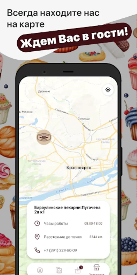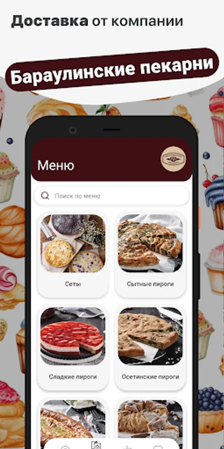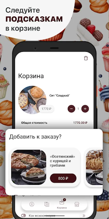 How to place an order in the “Baraulinskie bakery” application: select the items you like from the menu, add them to the cart and go to the checkout screen (by clicking on the cart icon).