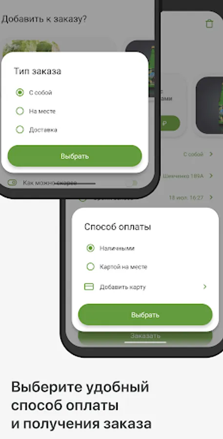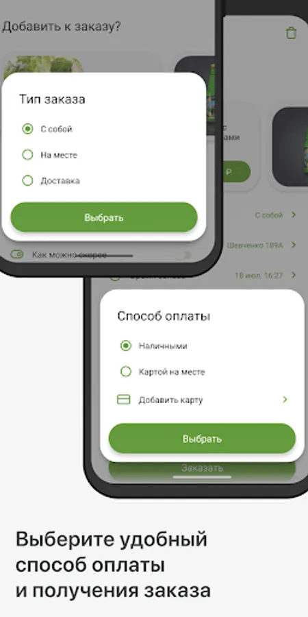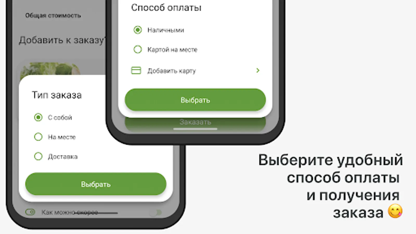 Specify the time when you want to pick up your order or select delivery with the time and address of delivery.
