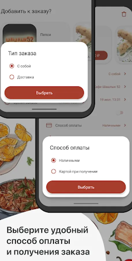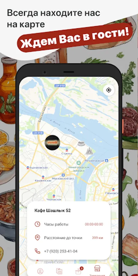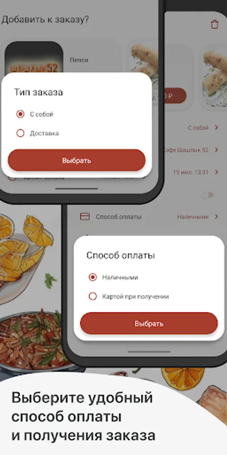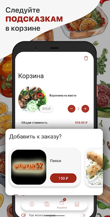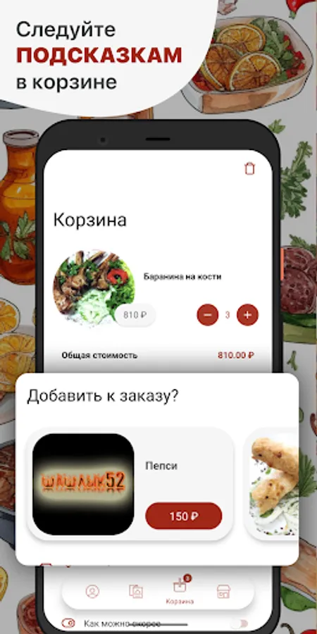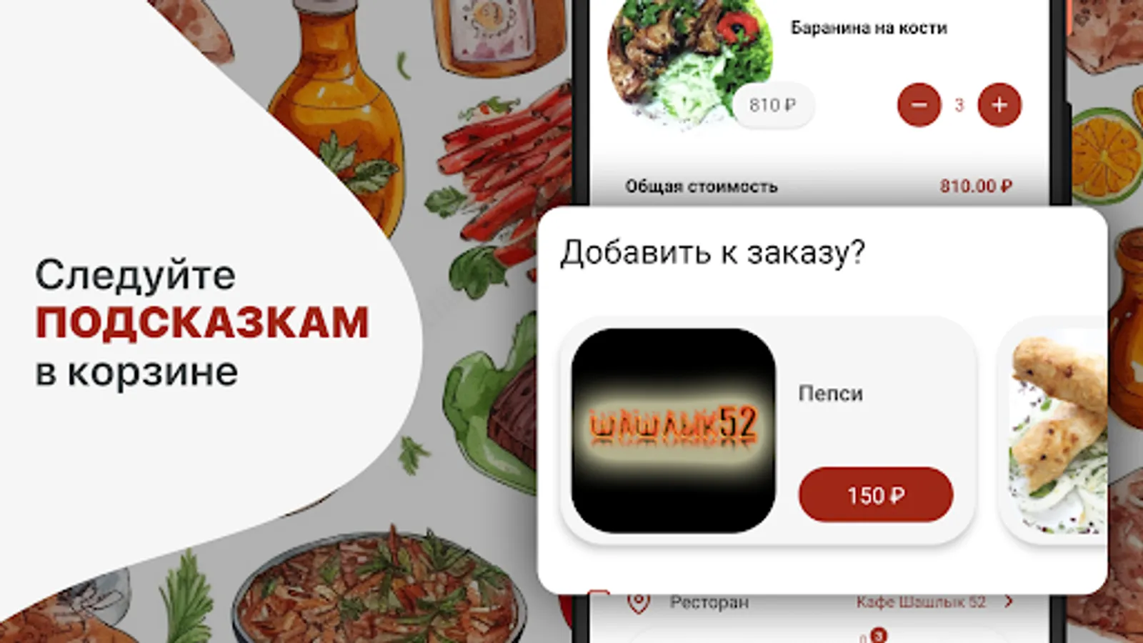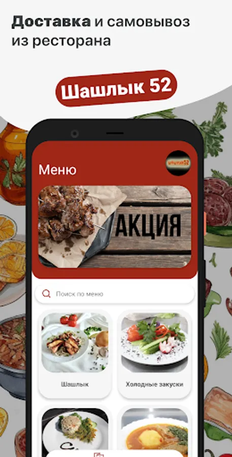 How to place an order in the application “Cafe Shishlyk 52”: select the items you like from the menu, add them to the basket and go to the checkout screen (by clicking on the basket icon).