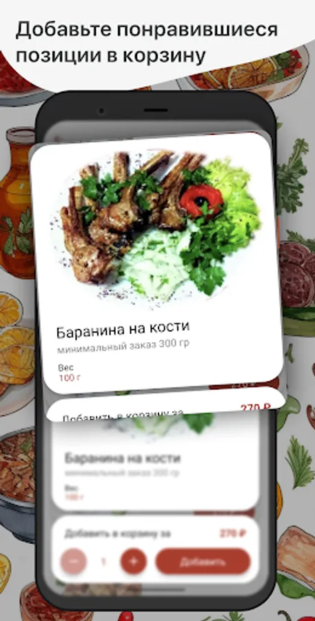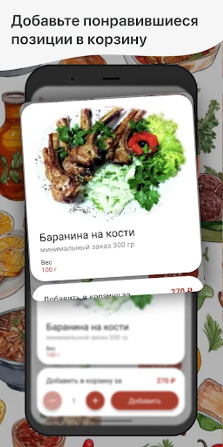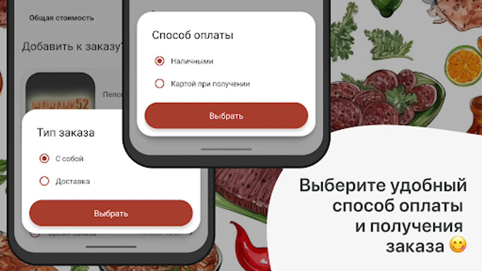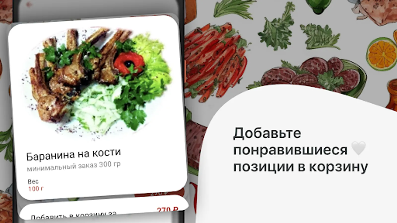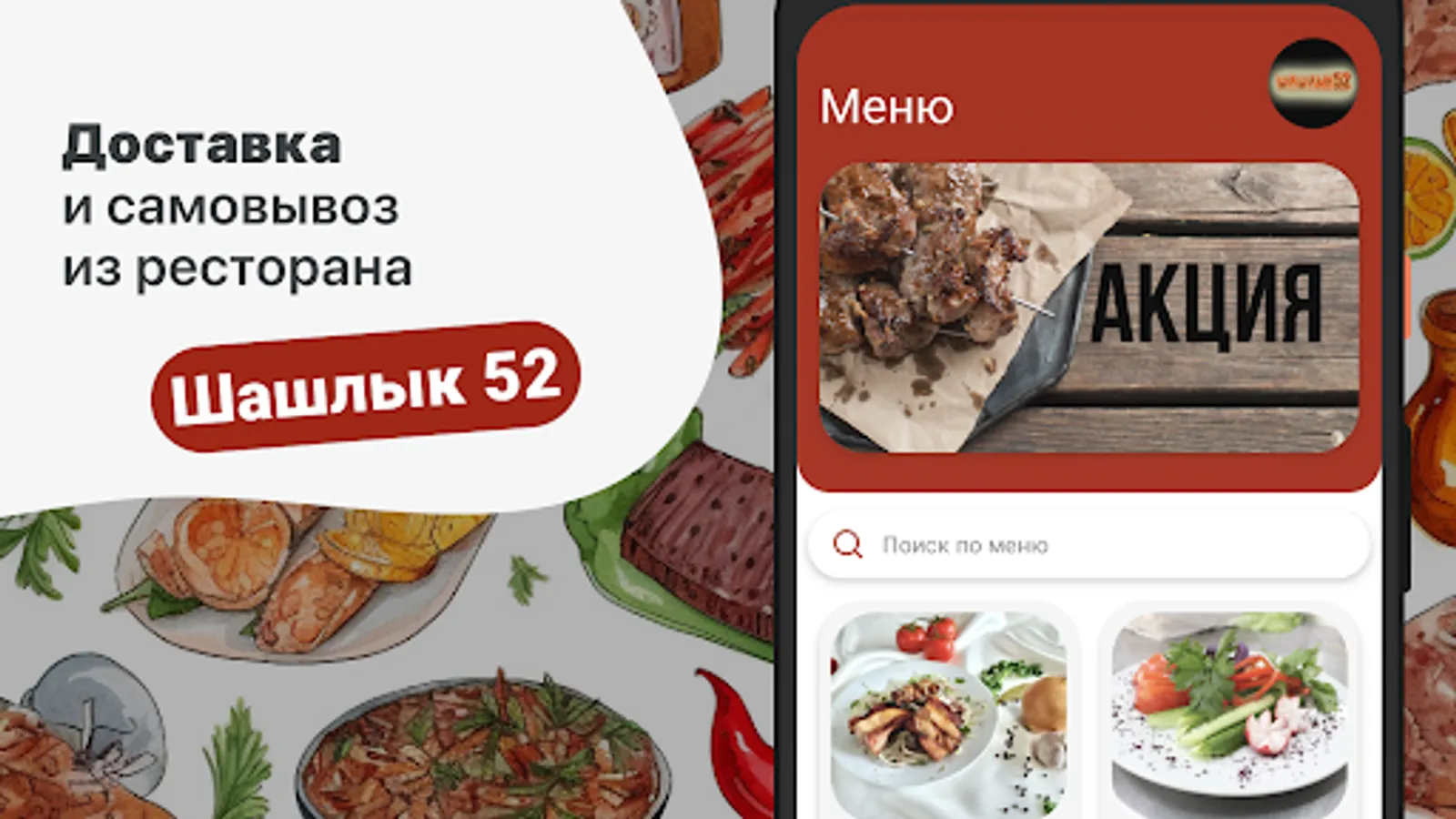 How to place an order in the application “Cafe Shishlyk 52”: select the items you like from the menu, add them to the basket and go to the checkout screen (by clicking on the basket icon).