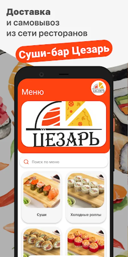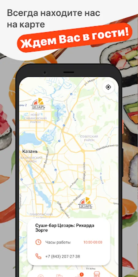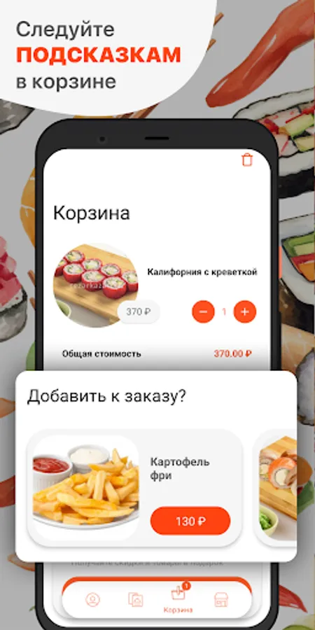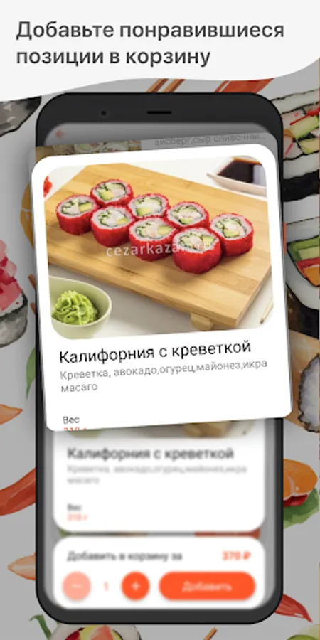How to place an order in the Caesar Sushi Bar application: select the items you like from the menu, add them to the basket and go to the checkout screen (by clicking on the basket icon).