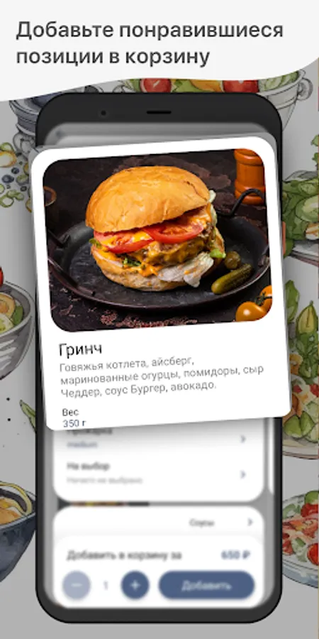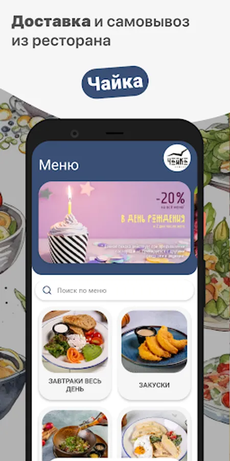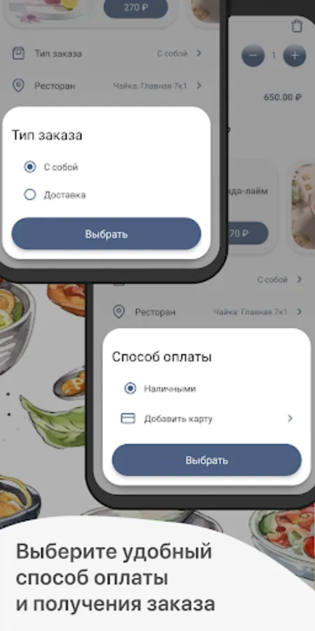 How to place an order in the Chaika application: select the items you like from the menu, add them to the basket and go to the checkout screen (by clicking on the basket icon).