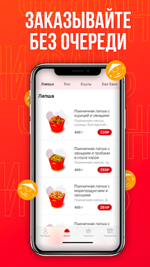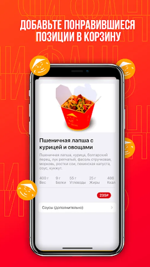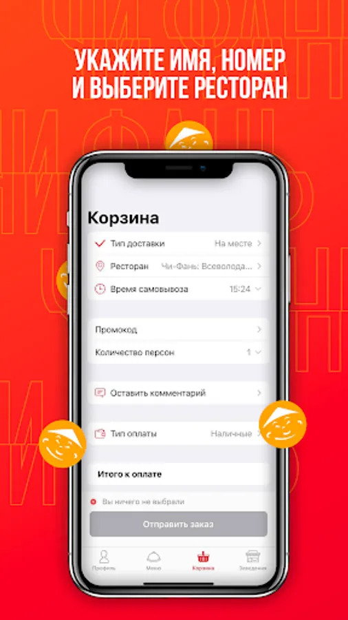How to place an order in the “Chi-Fan” application: select the items you like from the menu, add them to the basket and proceed to the checkout screen (by clicking on the basket icon).