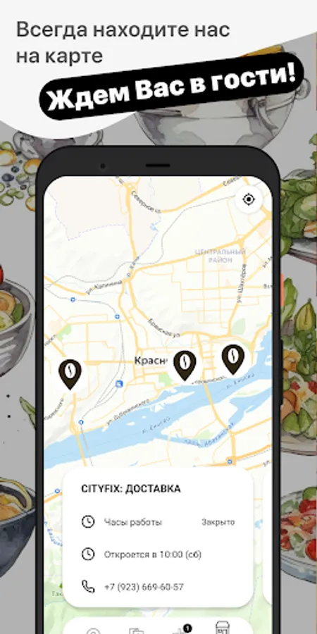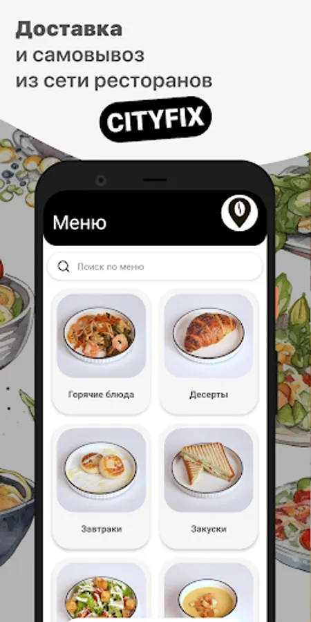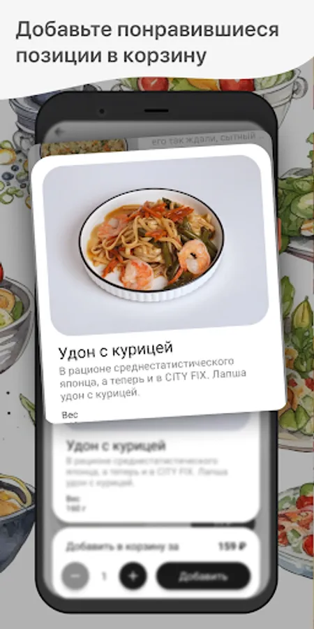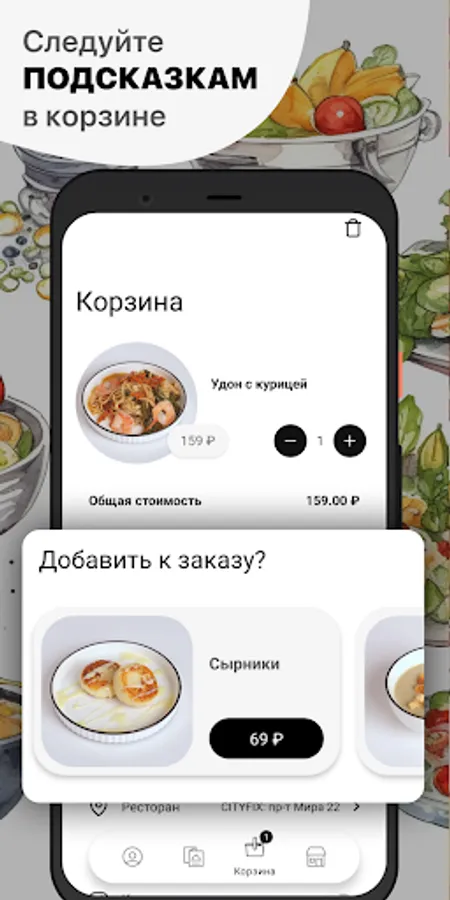 How to place an order in the CITYFIX application: select the items you like from the menu, add them to the basket and go to the checkout screen (by clicking on the basket icon).