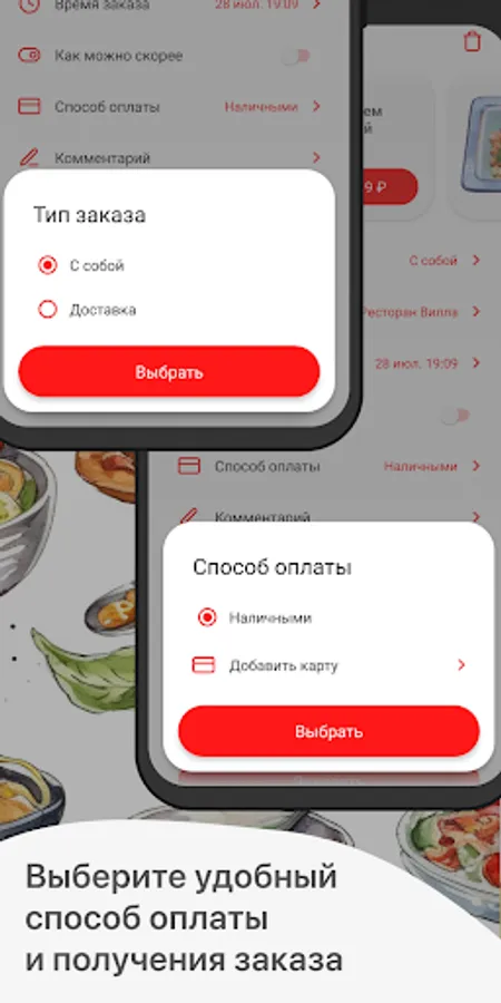 Specify the time when you want to pick up your order or select delivery with the time and address of delivery.