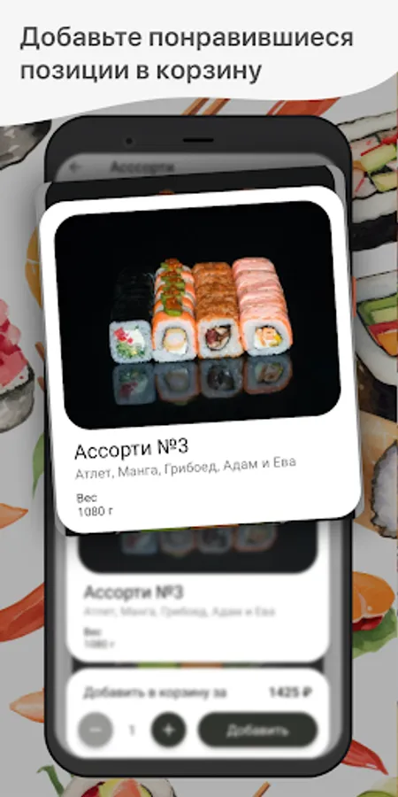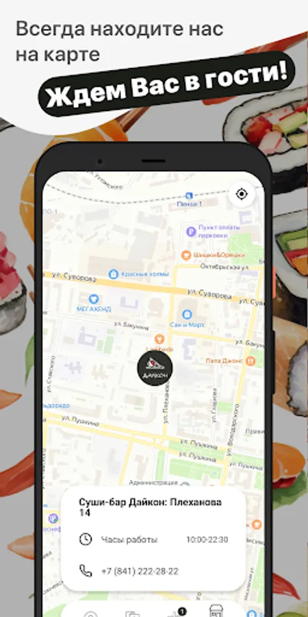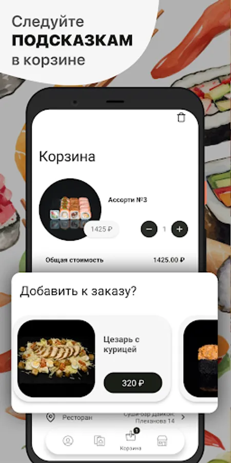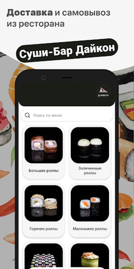 How to place an order in the application "Sushi Bar Daikon": select the items you like from the menu, add them to the cart and go to the checkout screen (by clicking on the cart icon).