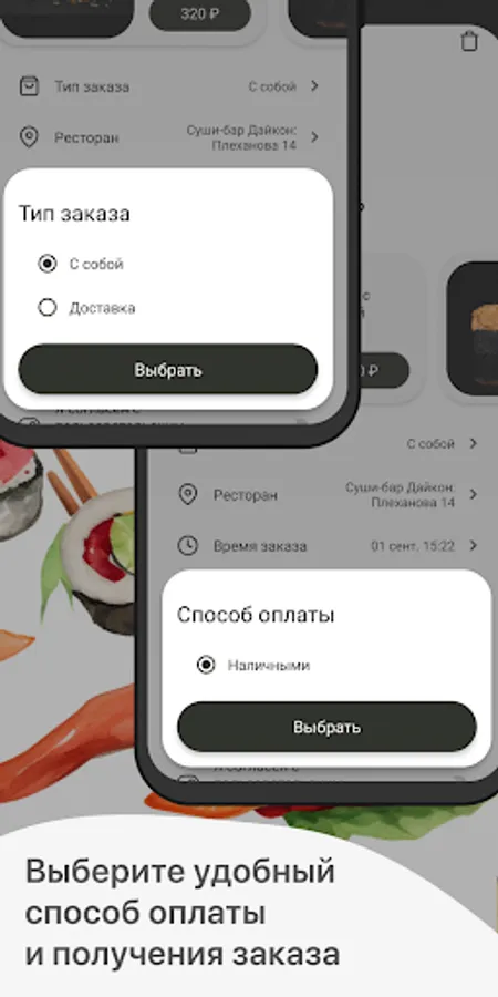 Specify the time when you want to come to pick up your order or select delivery with the indication of the time and delivery address.