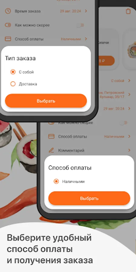 Specify the time when you want to pick up your order or select delivery with the time and address of delivery.