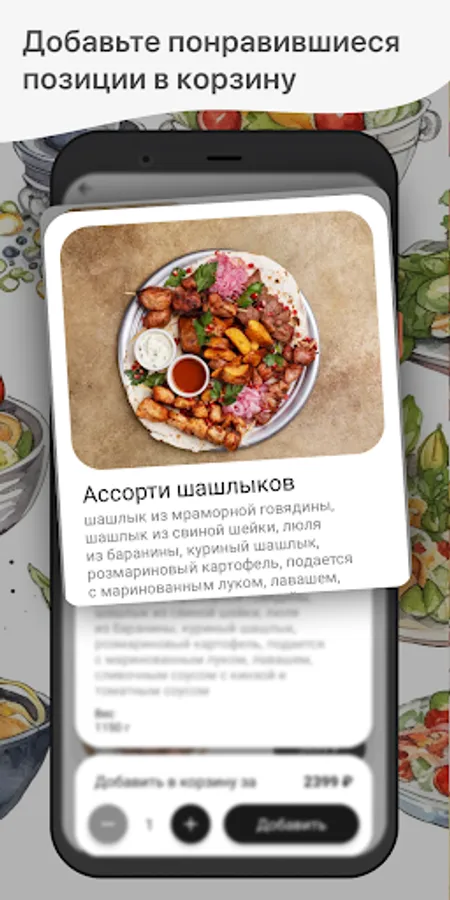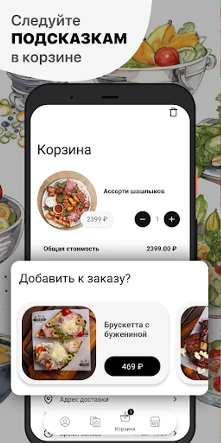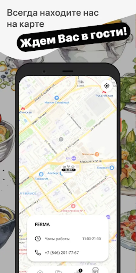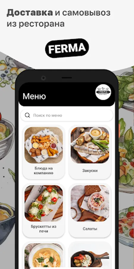 How to place an order in the “FERMA” application: select the items you like from the menu, add them to the basket and go to the checkout screen (by clicking on the basket icon).