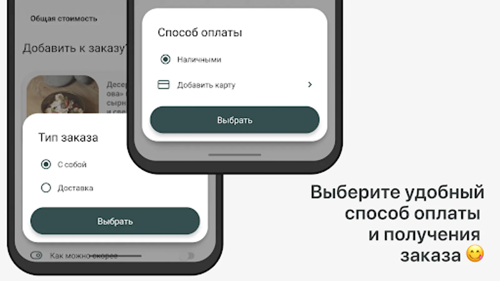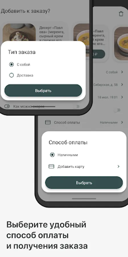 Specify the time when you want to pick up your order or select delivery with the time and address of delivery.