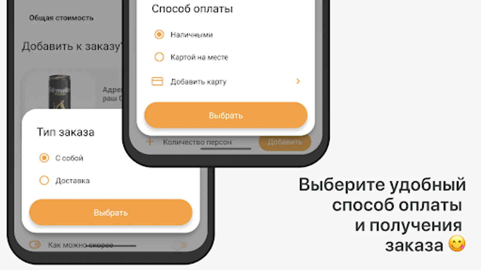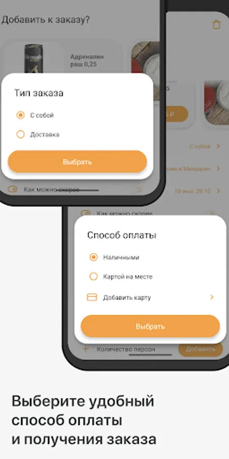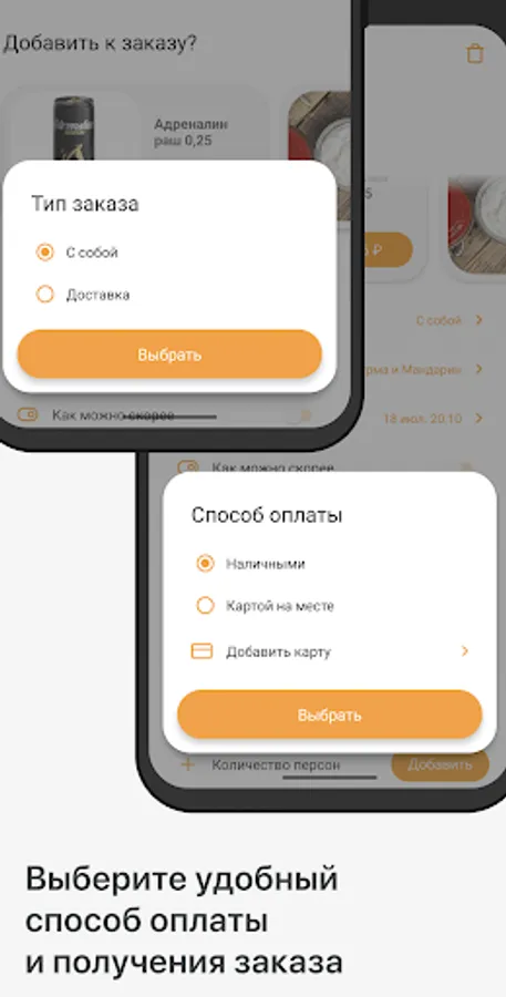 Specify the time when you want to come for your order or select delivery with the indication of the time and delivery address.