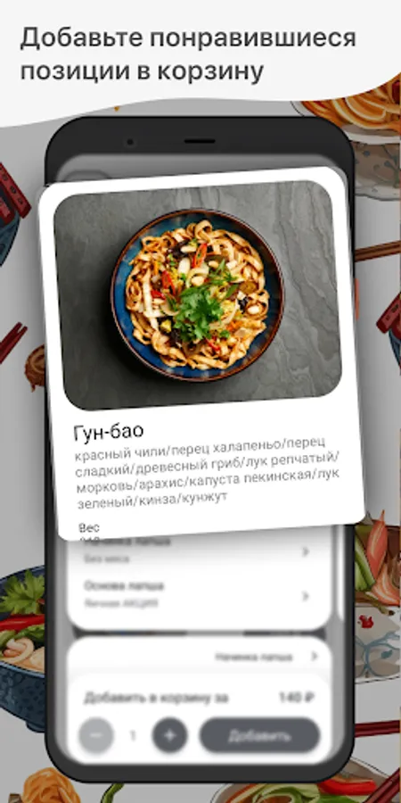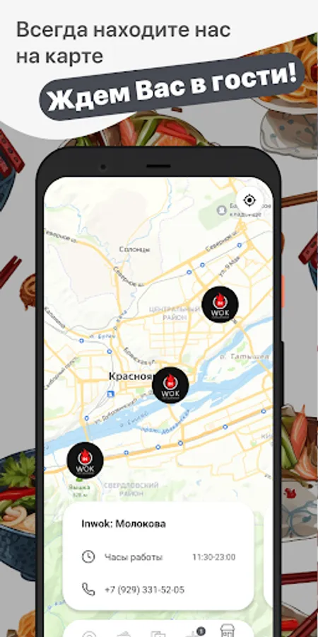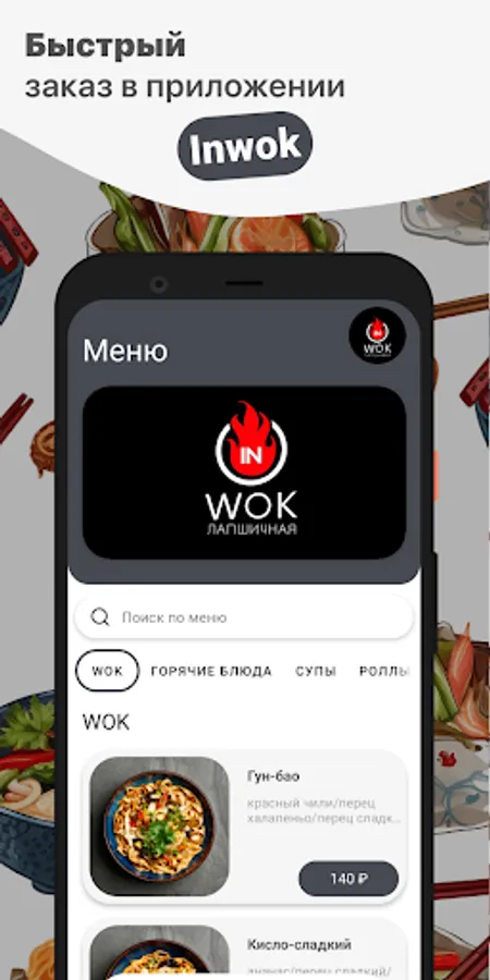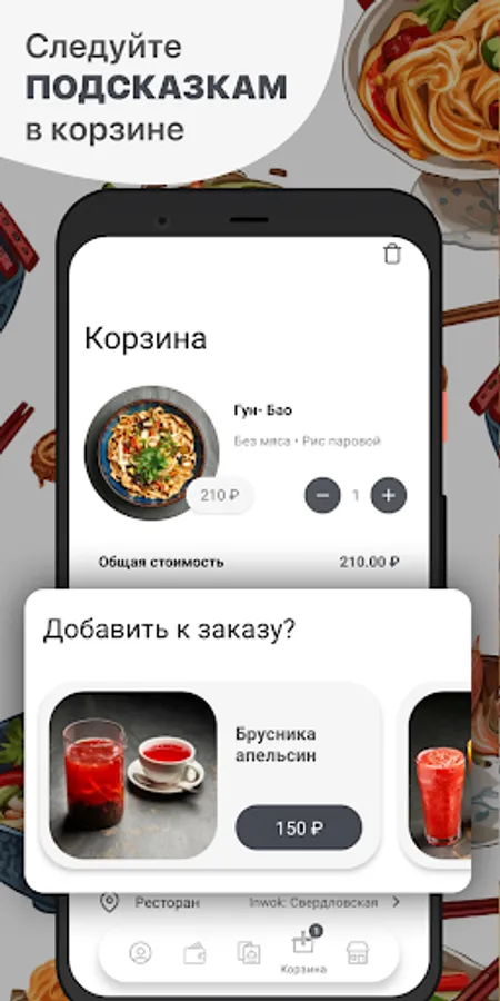 How to place an order in the “Inwok” application: select the items you like from the menu, add them to the basket and go to the checkout screen (by clicking on the basket icon).