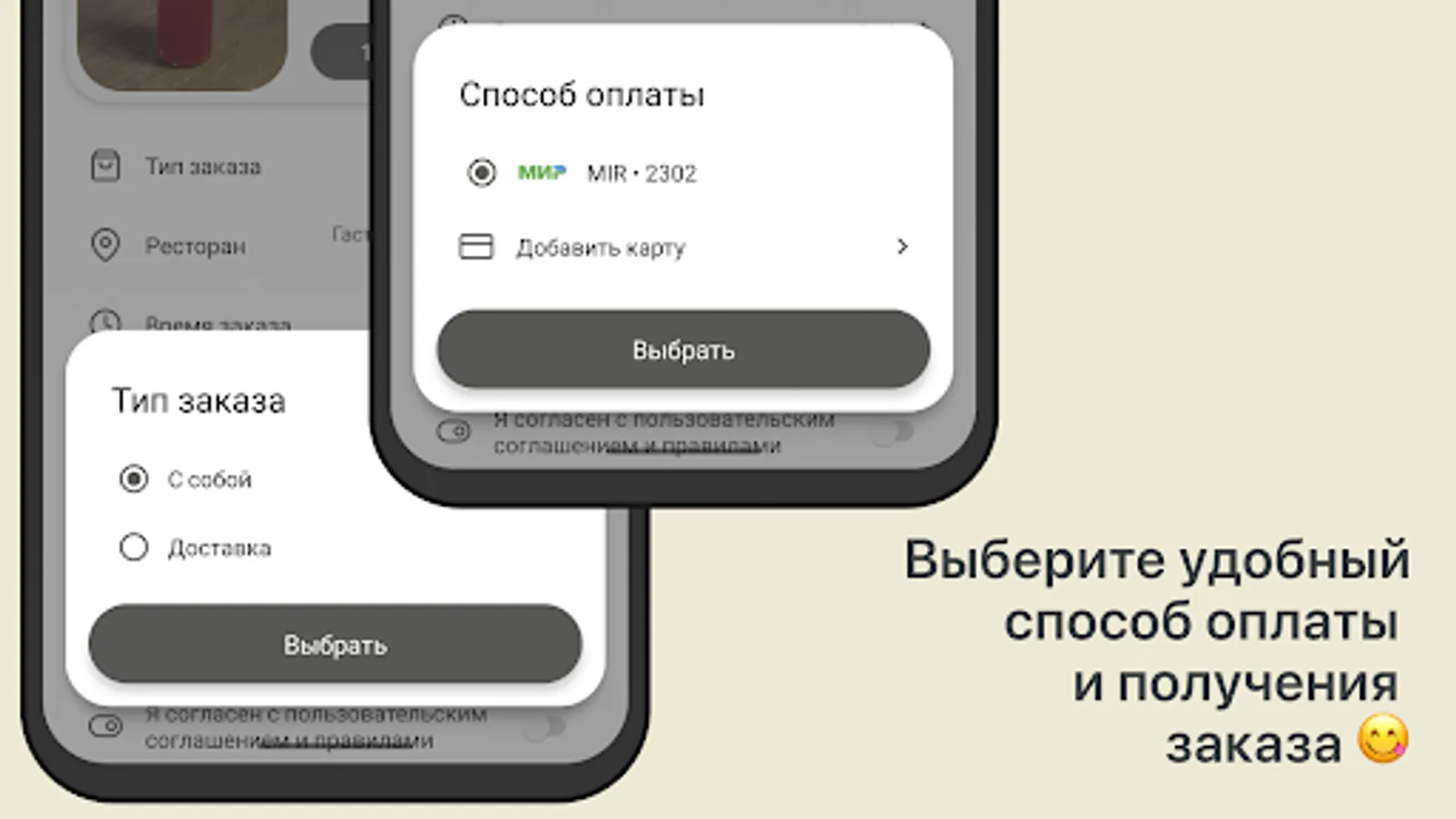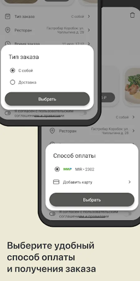 Choose a payment method: Cash or card. Accept the payment rules and click the “Order” button.