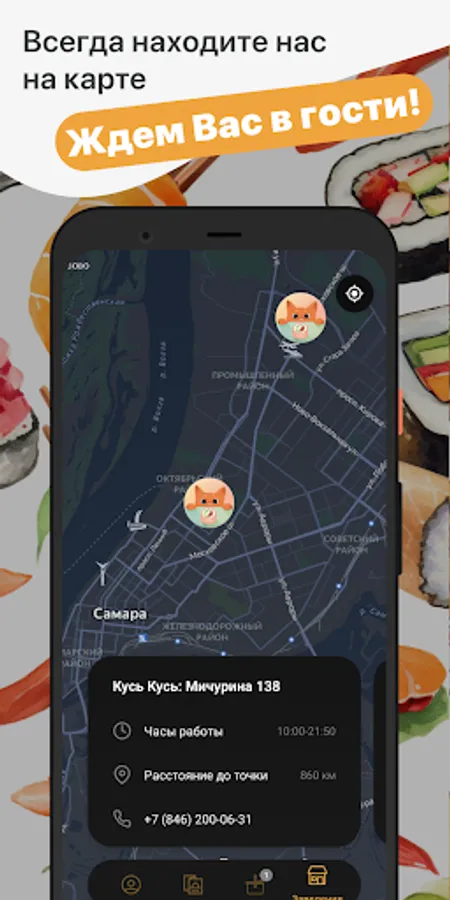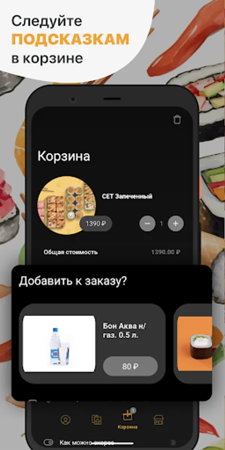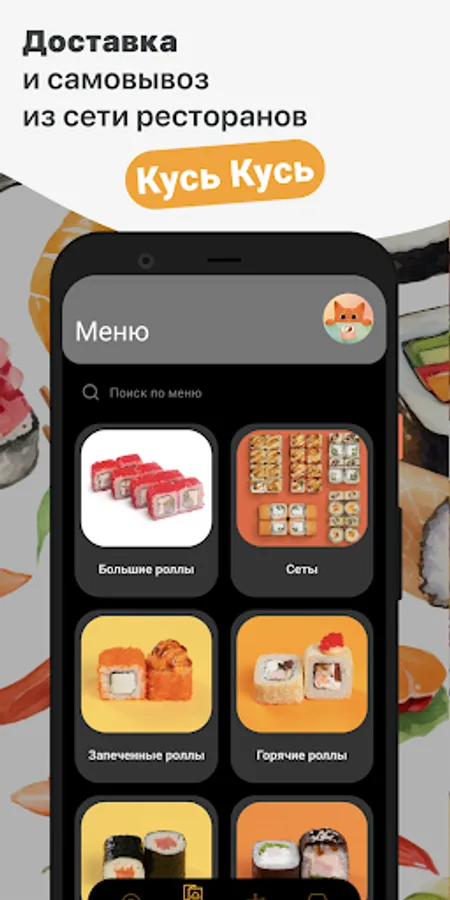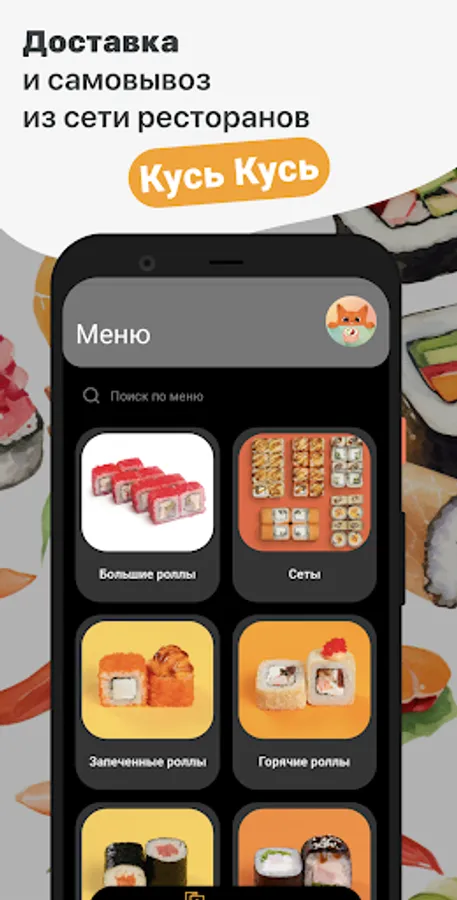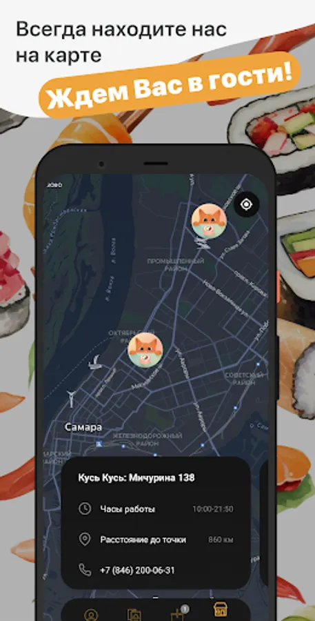 How to place an order in the “Kus Kus” application: select the items you like from the menu, add them to the basket and go to the checkout screen (by clicking on the basket icon).