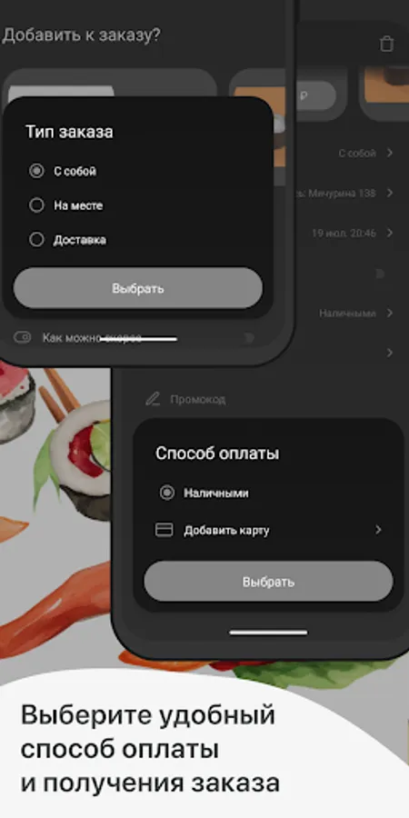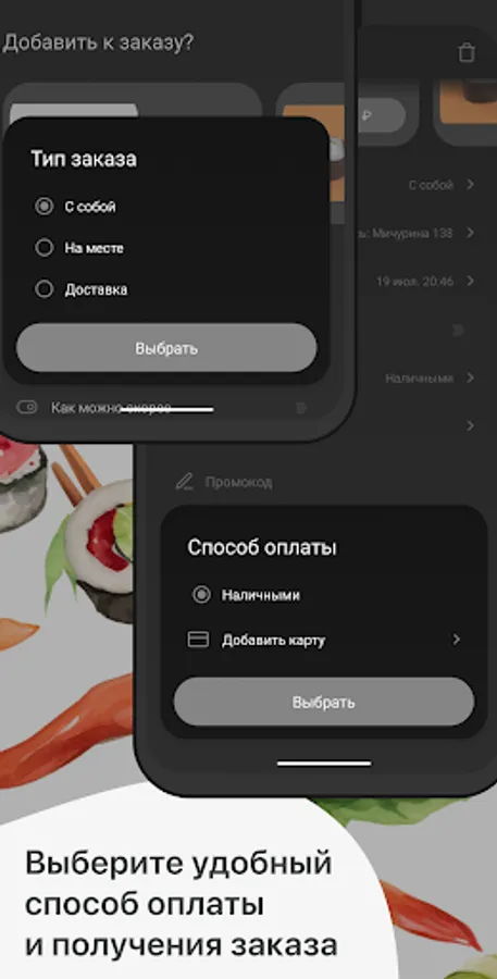 Indicate the time when you want to arrive for your order or select the delivery with the time and address of delivery.
