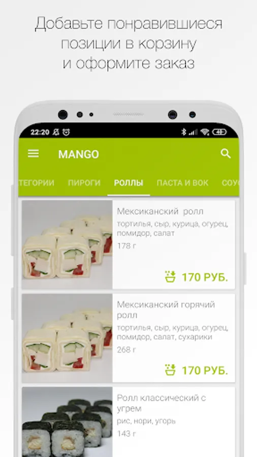 How to place an order in the “MANGO” application: select the items you like from the menu, add them to the basket and go to the checkout screen (by clicking on the basket icon).