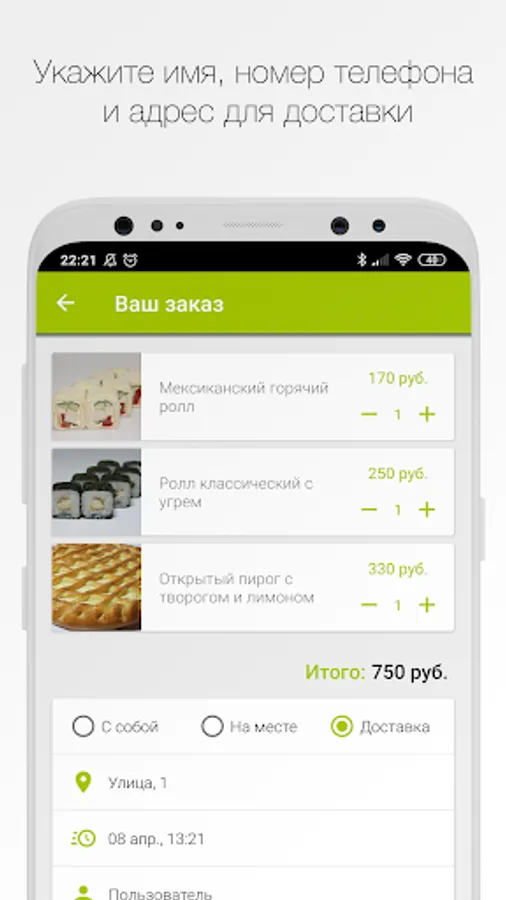 Indicate the time when you want to arrive for your order or select the delivery with the time and address of delivery.