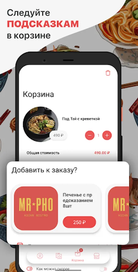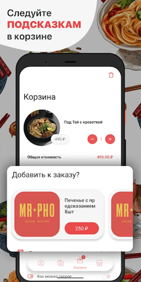 How to place an order in the "Mr Fo" application: select the items you like from the menu, add them to the cart and go to the checkout screen (by clicking on the cart icon).